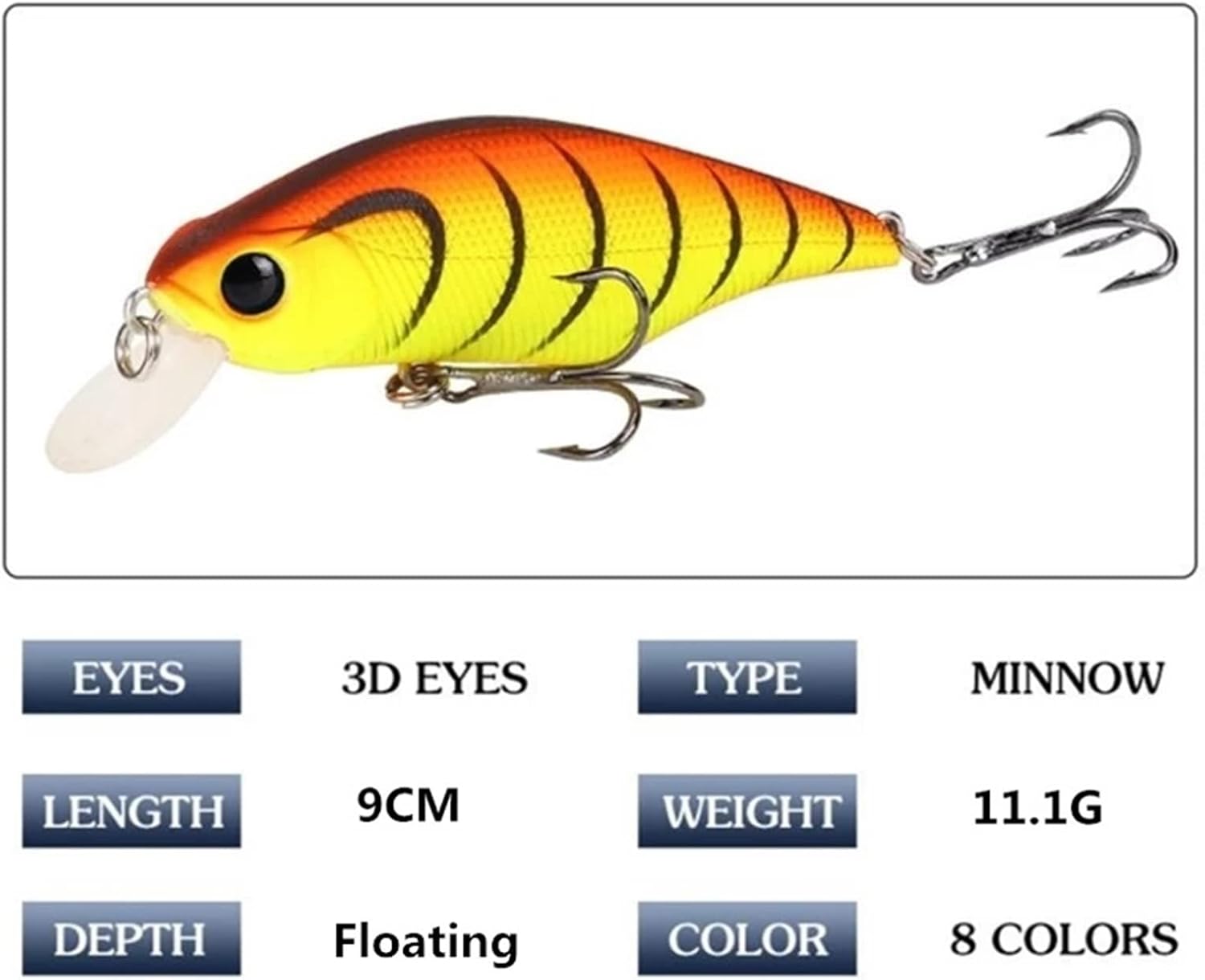 A crankbait is a lure with a plastic lip that dives underwater when it is reeled in. Crankbaits are used to target fish at specific depths.The longer the plastic lip, the deeper the bait will dive.They create life-like swimming actions in water!Bright colors, to attract big fish!3D eyes make it a powerful catching tool!Size: 10Pcs, 5.5cm 6.6gDiving Depth: SinkingQuality hooks: 2x Strong Treble HooksColors: Multiple colourTarget Fish: Pale chub,bass,Pikes,Yellowcheck carp,Chinese perch,Topmouth culter
