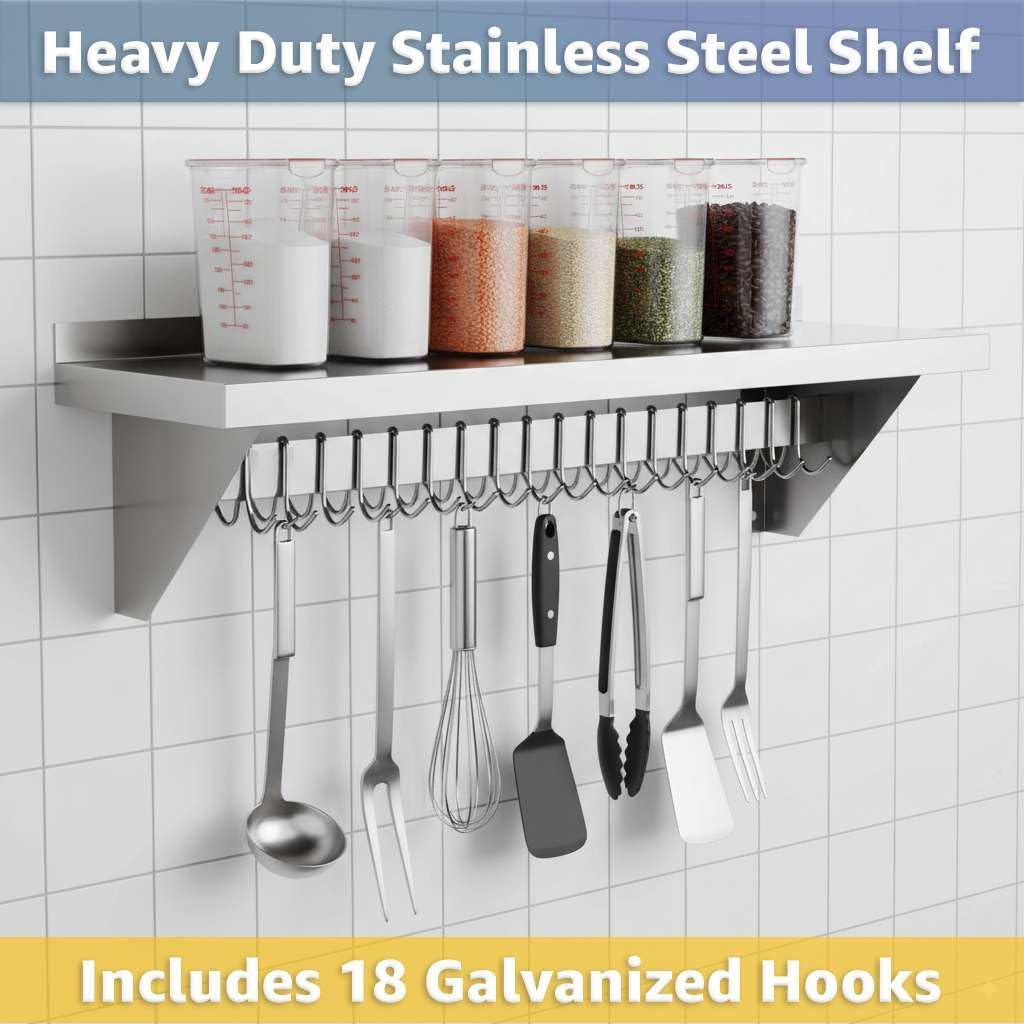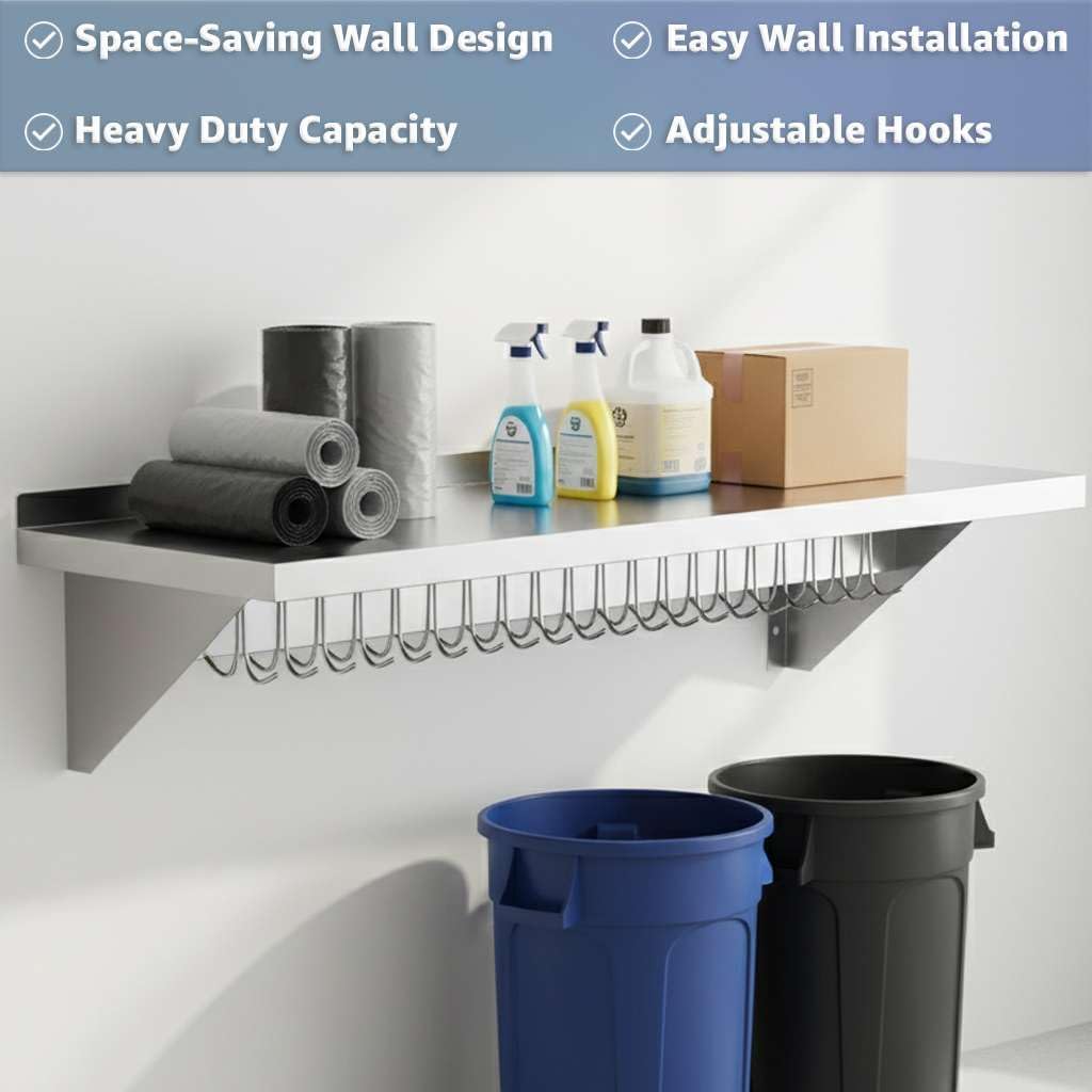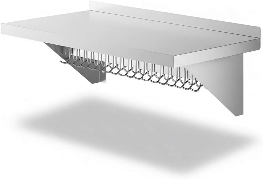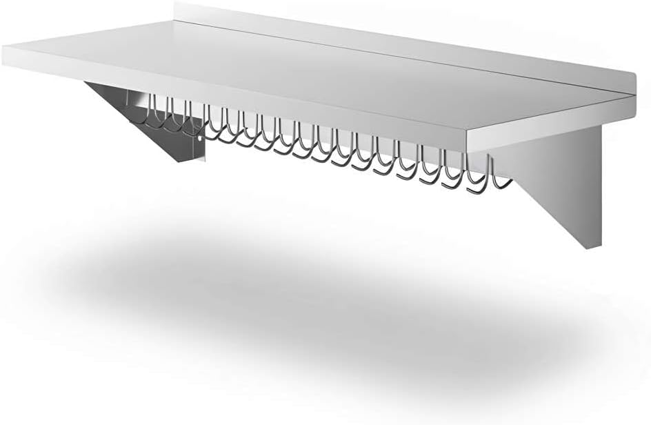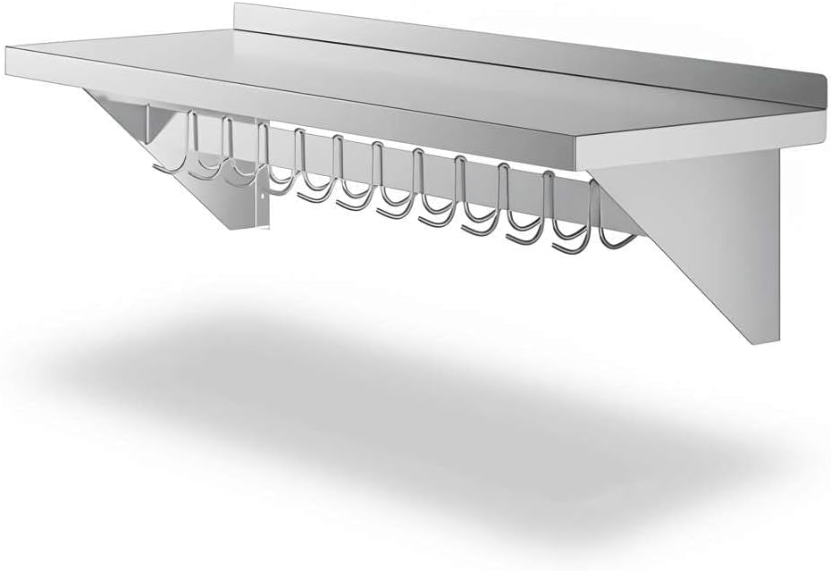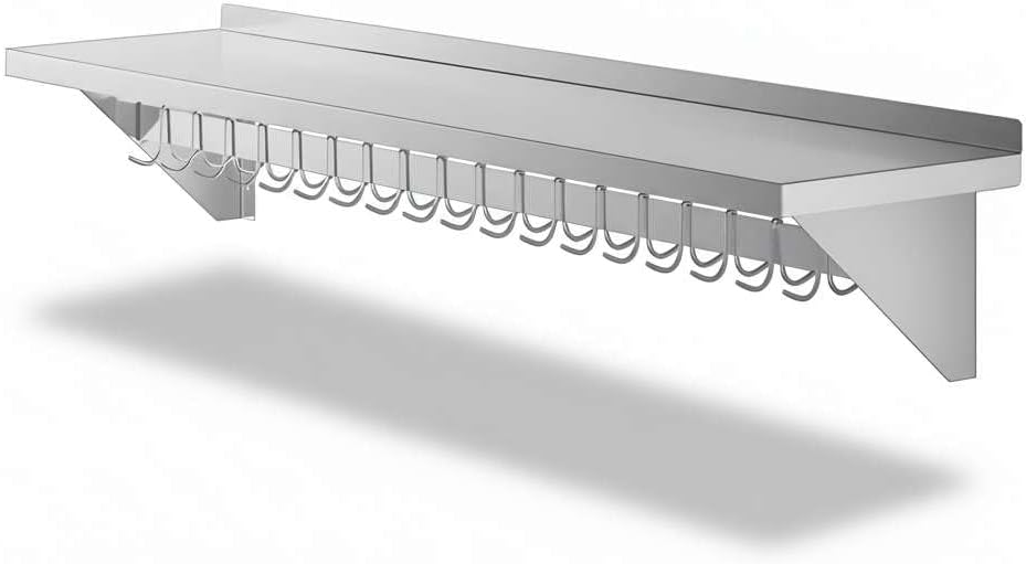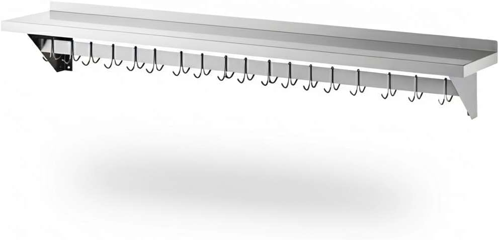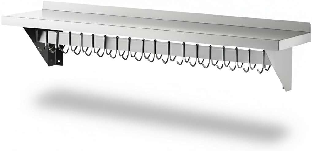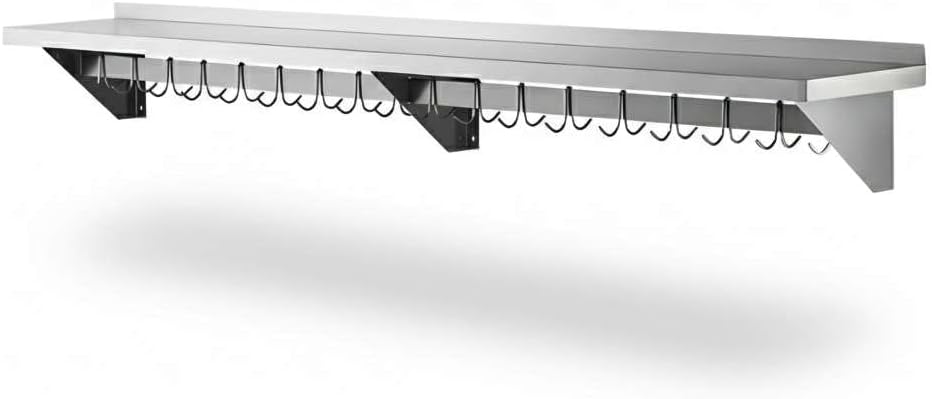 Professional-Grade Durability: Constructed from 18 gauge type 430 stainless steel, this NSF Listed wall shelf is built to withstand daily use in restaurants, hotels, cafeterias, bakeries, and catering kitchens. Its solid stainless surface provides a reliable, long-lasting workspace that maintains a clean, professional look even under heavy use.Generous Size and High Capacity: Measuring 12" deep and 60" long, this wall shelf provides ample storage space while keeping your kitchen organized. With a weight capacity of up to 285 lb., it can safely hold cookware, pans, utensils, dry ingredients, or small appliances, helping staff work more efficiently in busy prep areas.Integrated Hooks for Flexible Storage: The rack includes 18 galvanized removable hooks that can be easily adjusted to suit your needs. Hang bulky pots, sauté pans, strainers, ladles, aprons, or oven mitts directly under the shelf. This design frees up counter space and ensures your most-used tools are always within reach.Built-In Shelf for Extra Organization: The flat top shelf creates additional storage for lids, pot holders, cutting boards, or smaller kitchen supplies. This makes the unit perfect for maximizing vertical wall space in kitchens where every inch counts.Easy Installation: Pre-drilled mounting brackets make installation quick and simple. Please note: installation hardware is sold separately to allow compatibility with your wall type. Once installed, the unit provides secure, stable storage for heavy-duty use.Universal Applications: Perfect for professional kitchens in restaurants, cafés, hotels, and catering operations, this NSF wall shelf also works beautifully in home kitchens, pantries, garages, or workshops. Its versatile design makes it equally useful for cooking utensils, cleaning supplies, or even hand tools.