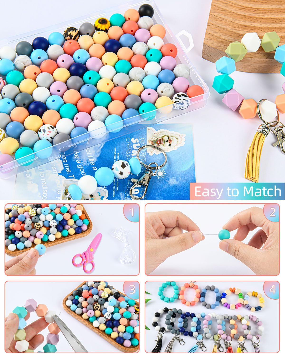 | Included Components | 10 wooden beads, 4 white rope clips, 140pcs round silicone beads and 12pcs printed silicone beads, 20pcs metal keychains, 10pcs tassels |