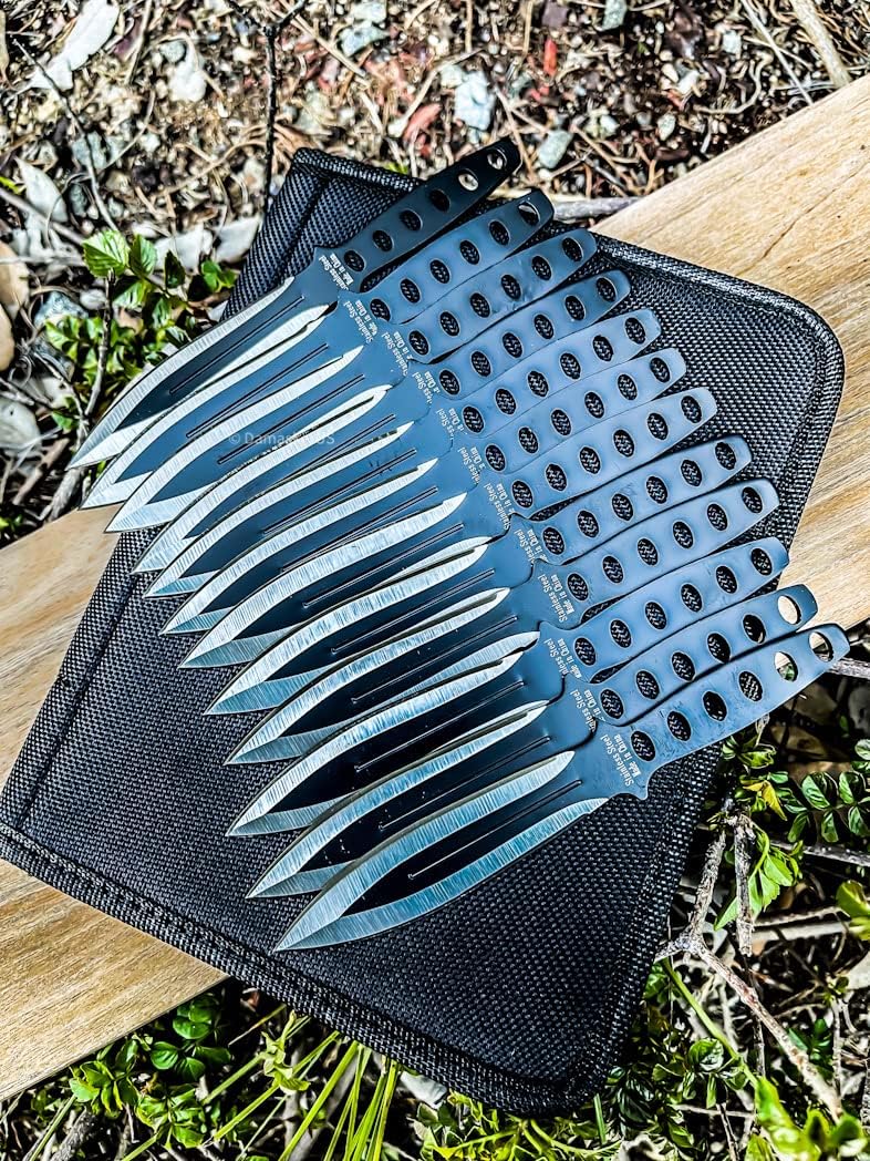 Description: Enlighten the excitement with this throwing knife. To throw knives, knives specially designed for throwing are required. This knife is designed to have the correct weight and balance for target throwing. This thrower is great for everyday practice and really sail through the air. With a sleek, futuristic styling, this throwing knife not only looks great, but throws perfectly as well. Features: 6" Overall Length 3.5" Blade Length 2.5" Handle Length Throwing Knives Set Slotted Handles Includes Sheath Have Confidence in your Throw with This Sturdy, Well Balanced Knife