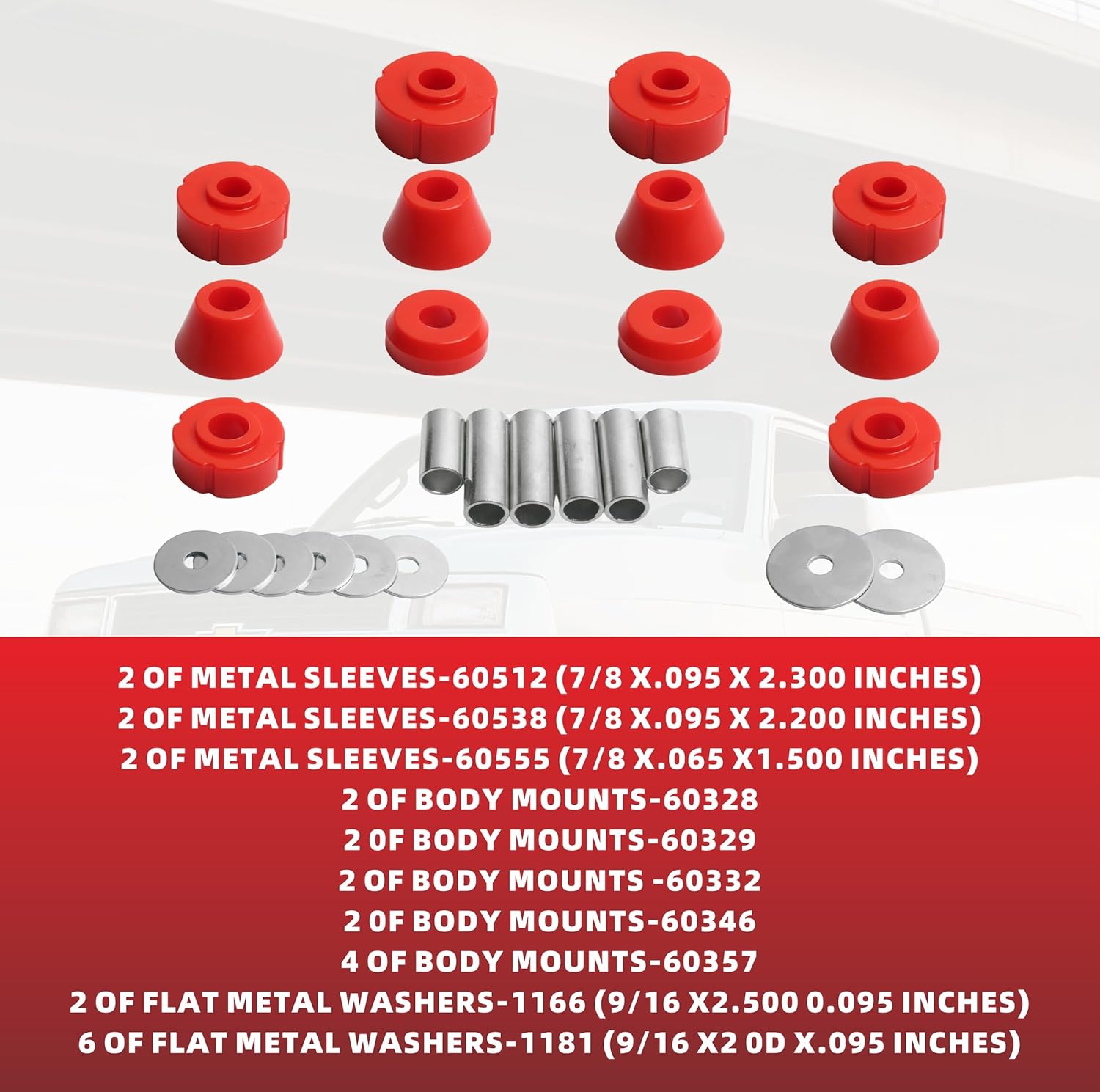 【Compatibility】Precision-molded for Chevrolet C10/C15 & GMC C1500/C2500 Regular Cab 【1967-1972】 | Validated via 3D laser scanning OEM #7-101 templates【Key Features】Lab-tested 62% road shock absorption vs. factory rubber | Maintains 0.5mm body-to-frame alignment tolerance for steering geometry preservation.Eliminates cab "body flex" during off-road articulation | Reduces door misalignment risks by maintaining chassis torsional rigidity. Towing & Off-Road Ready: Reinforced design handles 25% heavier loads than factory bushings.【Material】Grade Polyurethane 80A durometer rating withstands -40°F to 275°F | 300% higher fatigue resistance than OE rubber machined steel sleeves prevent compressive deformation | Zinc-plated hardware resists salt corrosion (2000hr salt spray tested) Lab-tested to withstand 3x more stress than rubber bushings—immune to oil, mud, and trail debris. Corrosion-Proof Chemistry: Hydrocarbon-resistant formula defies diesel and road salt degradation.【Customer Assurance】Backed by our replacement & return policy and product warranty. our dedicated team of specialists is ready to assist you anytime. For the fastest resolution, simply contact us with your photos/video about problem for priority, 24-hour response.