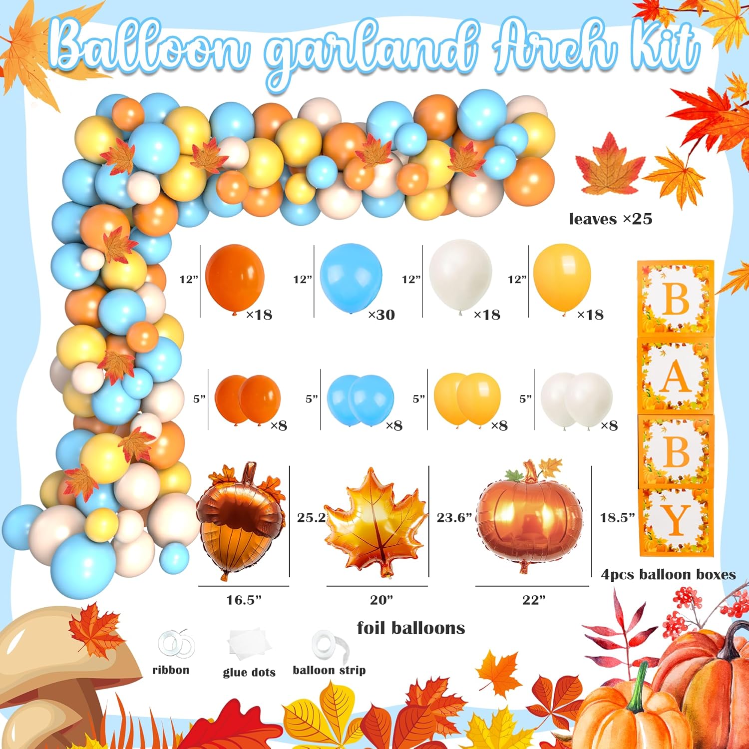 | Included Components | Backdrop, Balloon Strip, Cake Topper, Glue Dots, 84 x 12’ Latex Balloons, 32 5’ Nut Foil Balloon, Maple Leaf Pumpkin Tablecloth, 10 Cupcake Toppers, Ribbons, Banner, 25 Leaves, ‘Mommy to Be’ Sash, 4 Pumpkin-themed Baby Boxes |