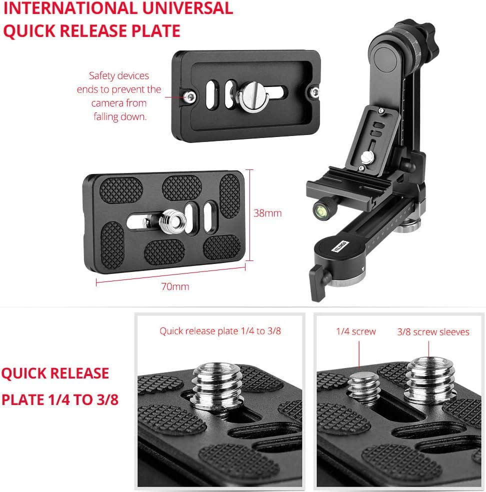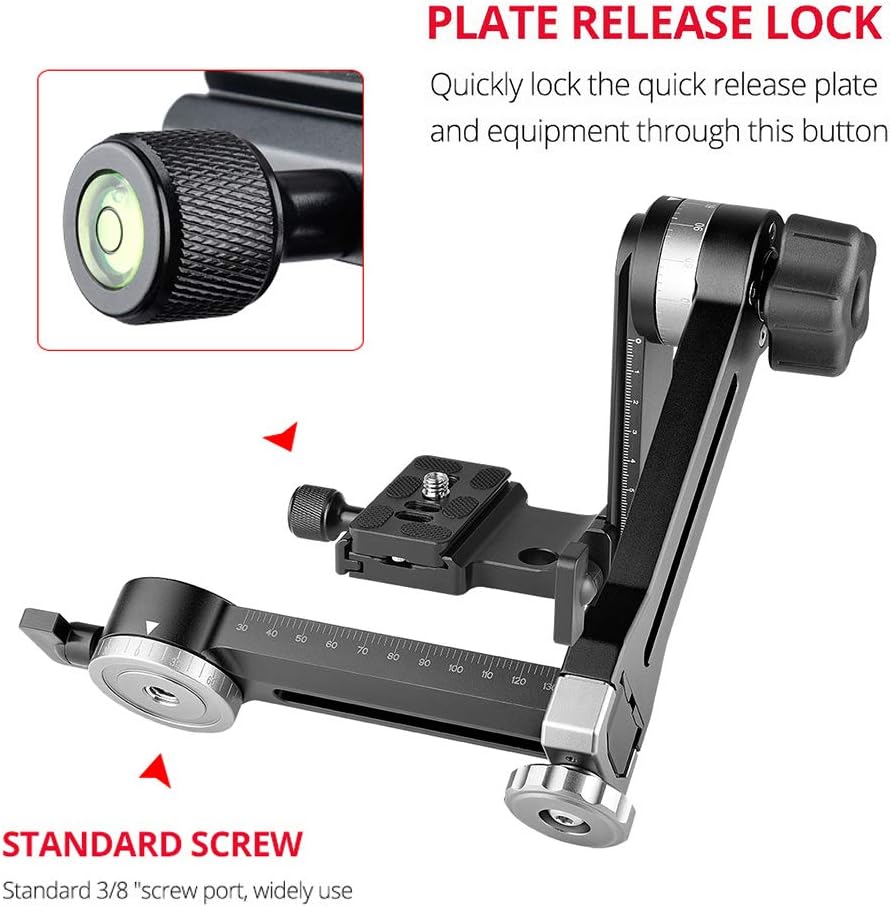 Features: Professional gimbal tripod head, made of aluminum alloy material, rugged design and sturdy construction. International universal quick release plate with 1/4 inch & 3/8 inch screw for fast and easy camera installation; with safety devices on both ends to prevent the camera from falling down. The swinging arm has a 360 degree scale, fine-tuned damping, can adjust the camera's shooting angle as you needs; swinging arm has a strong lock knob,and the weight placed horizontally can reach 15kg/33lbs without loosening. The panning base is equipped with a 360 degree horizontal scale, which is exactly matched, suitable for panoramic views shooting. 3/8 inch screw hole at the bottom allows you to install the head to most of tripod stand; large knob with bubble level for more convenient operation. Specifications: Brand: Andoer Color: Black Material: Aluminum Alloy Item Weight: 1250g/ 2.8lbs Load Capacity: 15kg/33lbs Note: For camera with telephoto zoom lens, you need to buy a tripod mount ring additionally for it to work properly and for better balance. Package List: 1 * Tripod Head