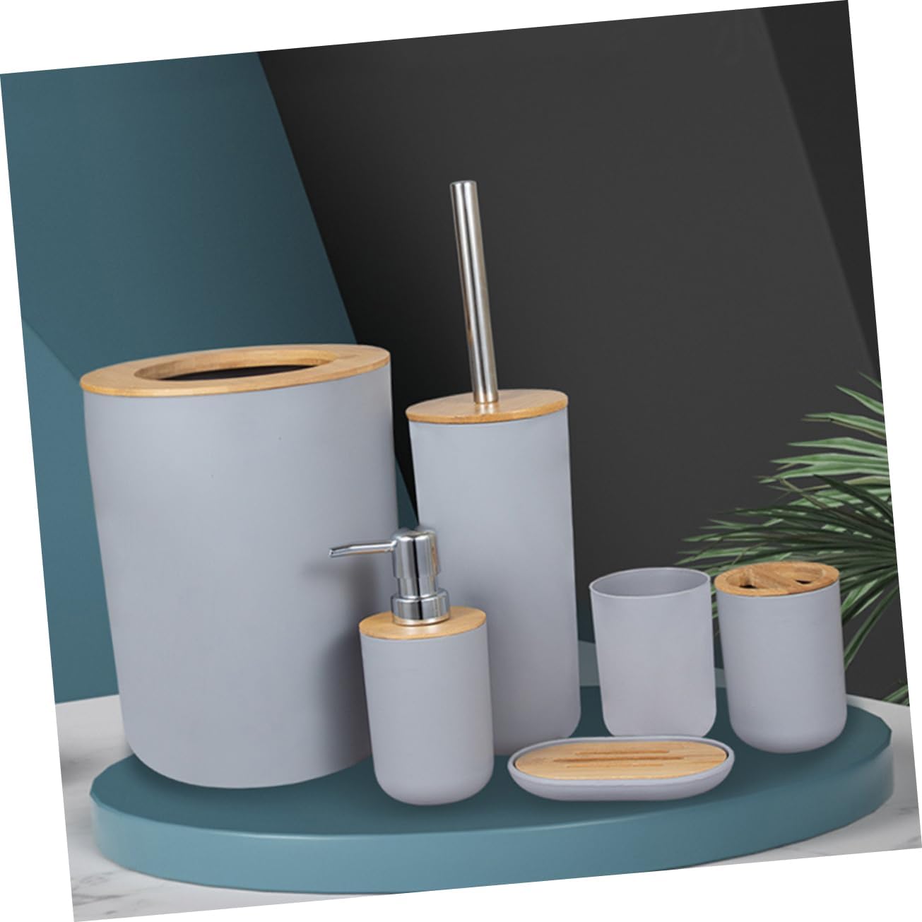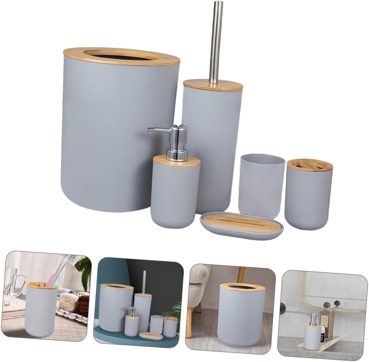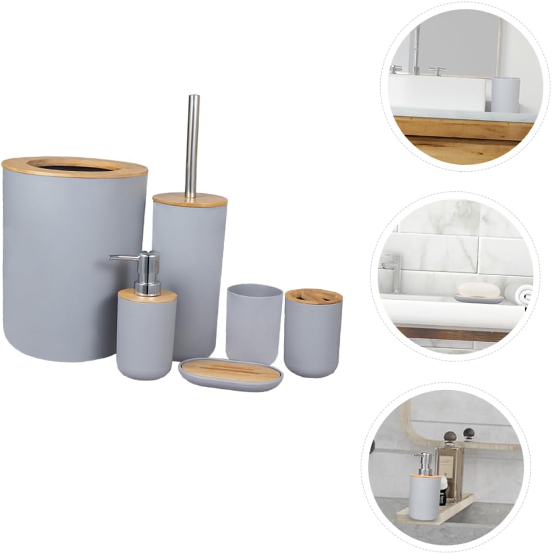Package List 1 x trash can 1 x toilet brush 1 x lotion bottle 1 x soap box 1 x toothbrush cup 1 x cup Characteristics - Size: 2500X1950X1950 cm/982X766X766 inch Lotion Bottle. - Material: wood and plastic Toilet Washing Accessory. - This wash cup is beautiful and elegant storage box for bathroom accessories with Bathroom Washing Supplies. - The thoughtful design ensures convenient storage, make your bathroom clean and tidy Toilet Brush. - Small size, easy to carry, easy to use and store. The appearance is simple and classic. Bathroom Trash Can - The bathroom supply includes trash can, cup, lotion bottle, toilet brush, soap dish and toothbrush cup, which is easy to use Toilet Washing Supply. - Fine workmanship, wonderful detail, multipurpose and excellent, and useful for household use Toothbrush Cup.Goods DescriptionToilet Washing Accessory Fine workmanship and beautiful appearance, can ensure its popularity among women and men.Washing Cup The toilet washing accessories are multipurpose and great for you.Lotion Bottle This item is useful bathroom supplies set, which is made of for use
