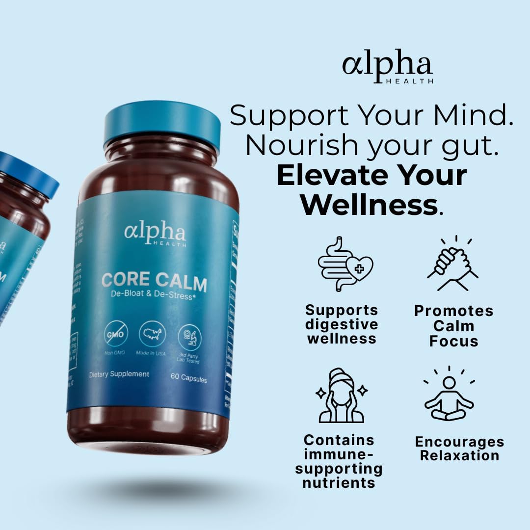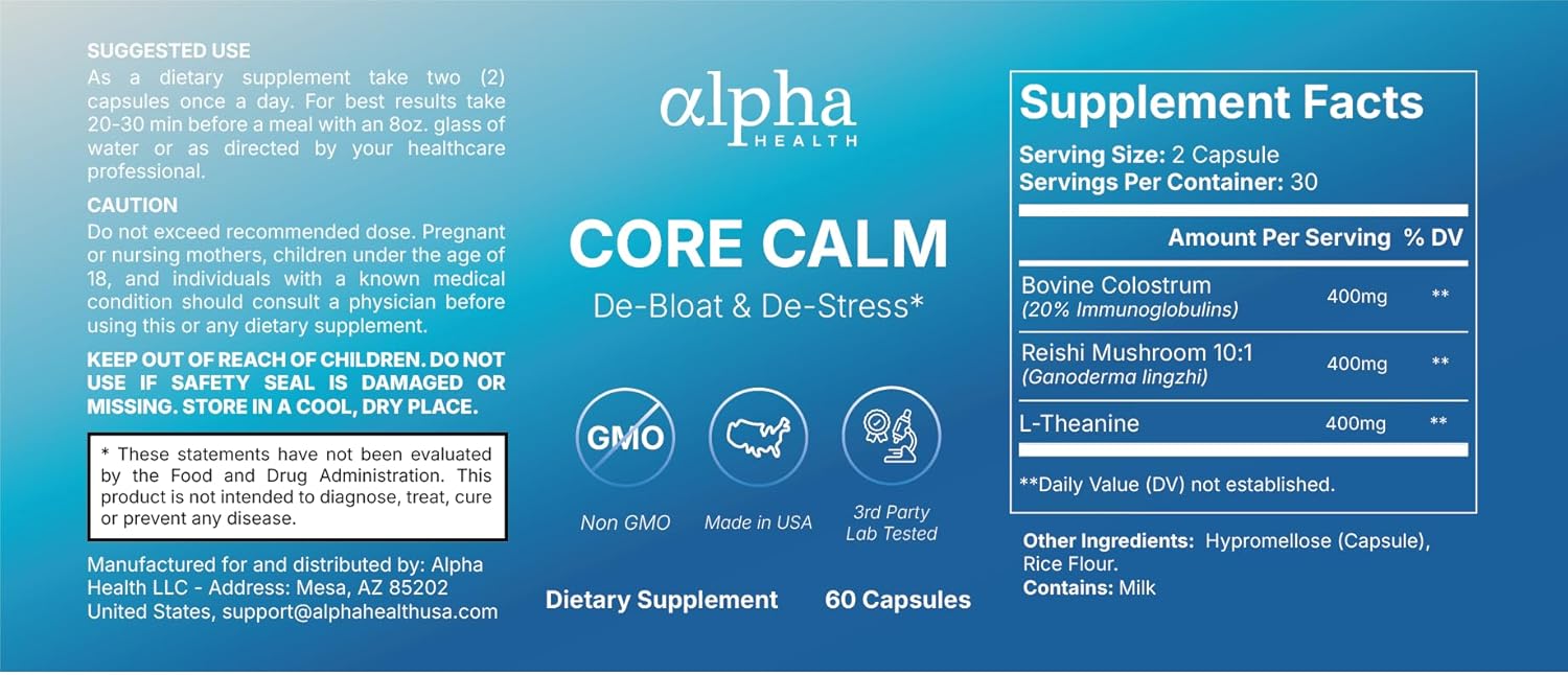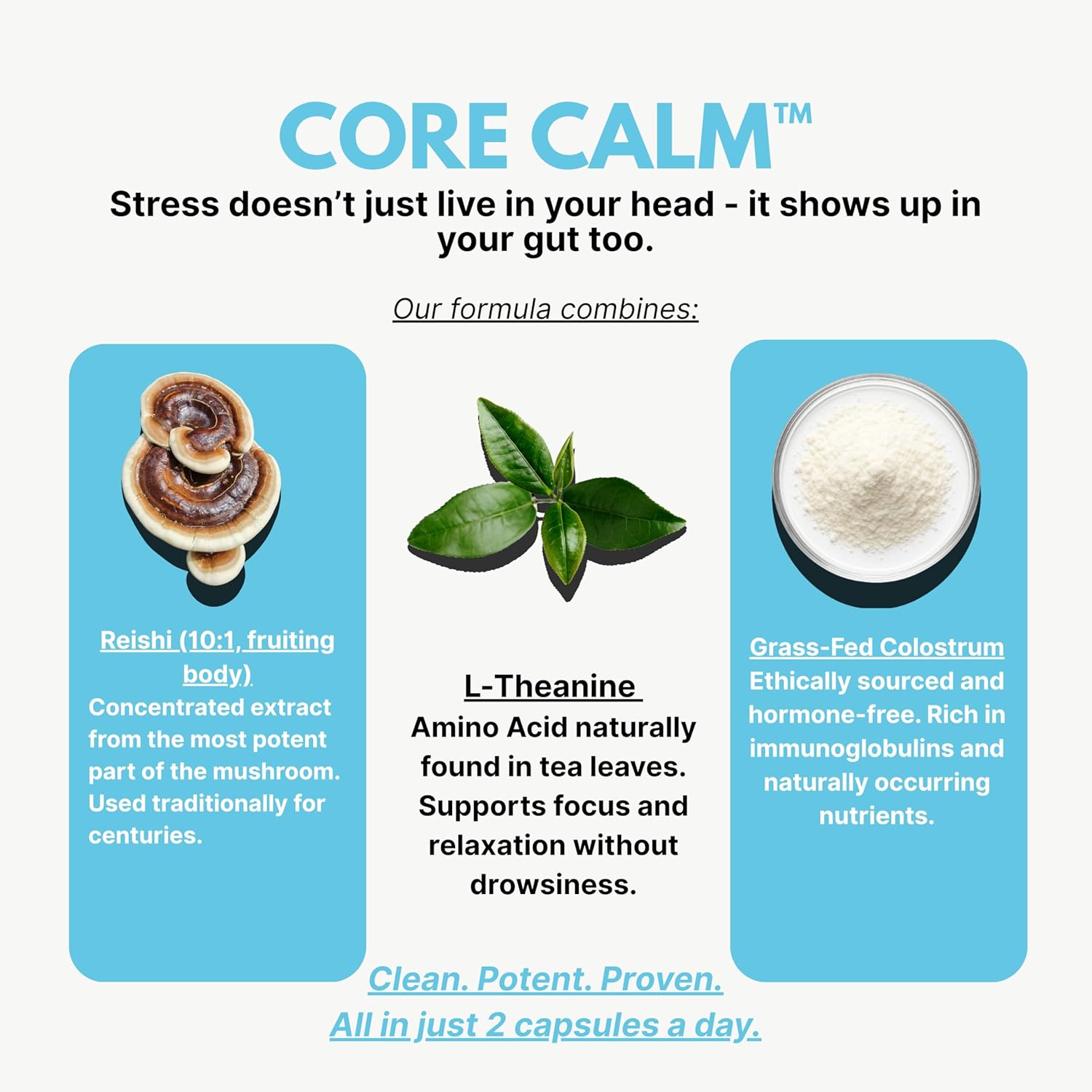 Core Calm by AlphaHealth is a natural, thoughtfully formulated daily supplement designed to support the mind-gut connection for a healthy stress response and digestive comfort. The mind and gut are closely connected, and everyday stress and can impact how balanced and comfortable your mind and gut feel. Core Calm is crafted to help support a response to this connection using clean, high-quality ingredients that promote overall wellness. Core Calm is made with a carefully selected blend of Reishi Mushroom 10:1 (Fruiting Body Extract), L-Theanine, and grass-fed Colostrum, chosen for their long history of use and clinical research supporting their role in relaxation, digestive comfort, and immune support. This synergistic formula is designed to help the body maintain balance and promote a sense of calm and ease as part of a daily wellness routine. We take a quality-first, holistic approach to formulation. Core Calm is made with non-GMO ingredients, potent fruiting body only mushroom extrct, grass-fed colostrum, and is filler-free and heavy-metal tested to ensure purity, potency and safety. Every batch is crafted with care to support consistent, reliable quality.