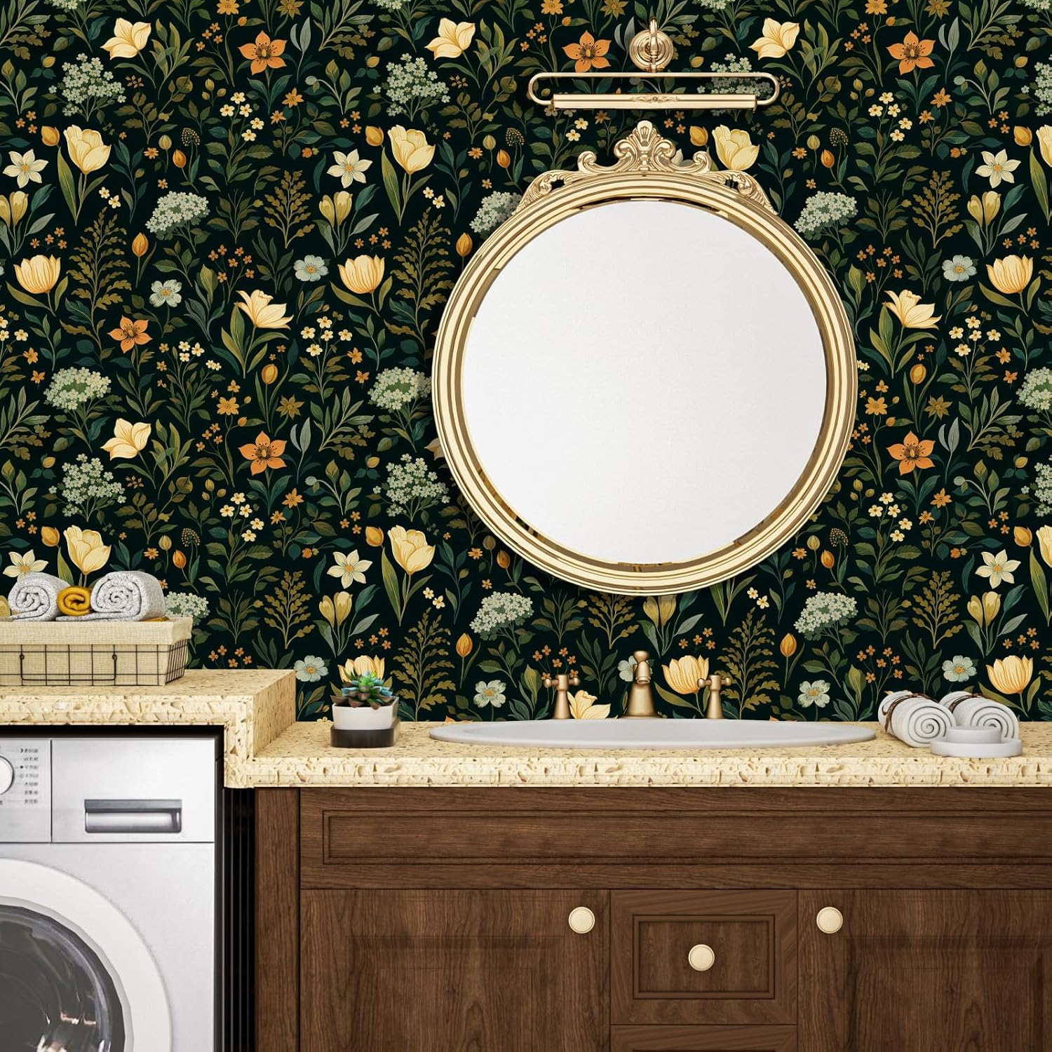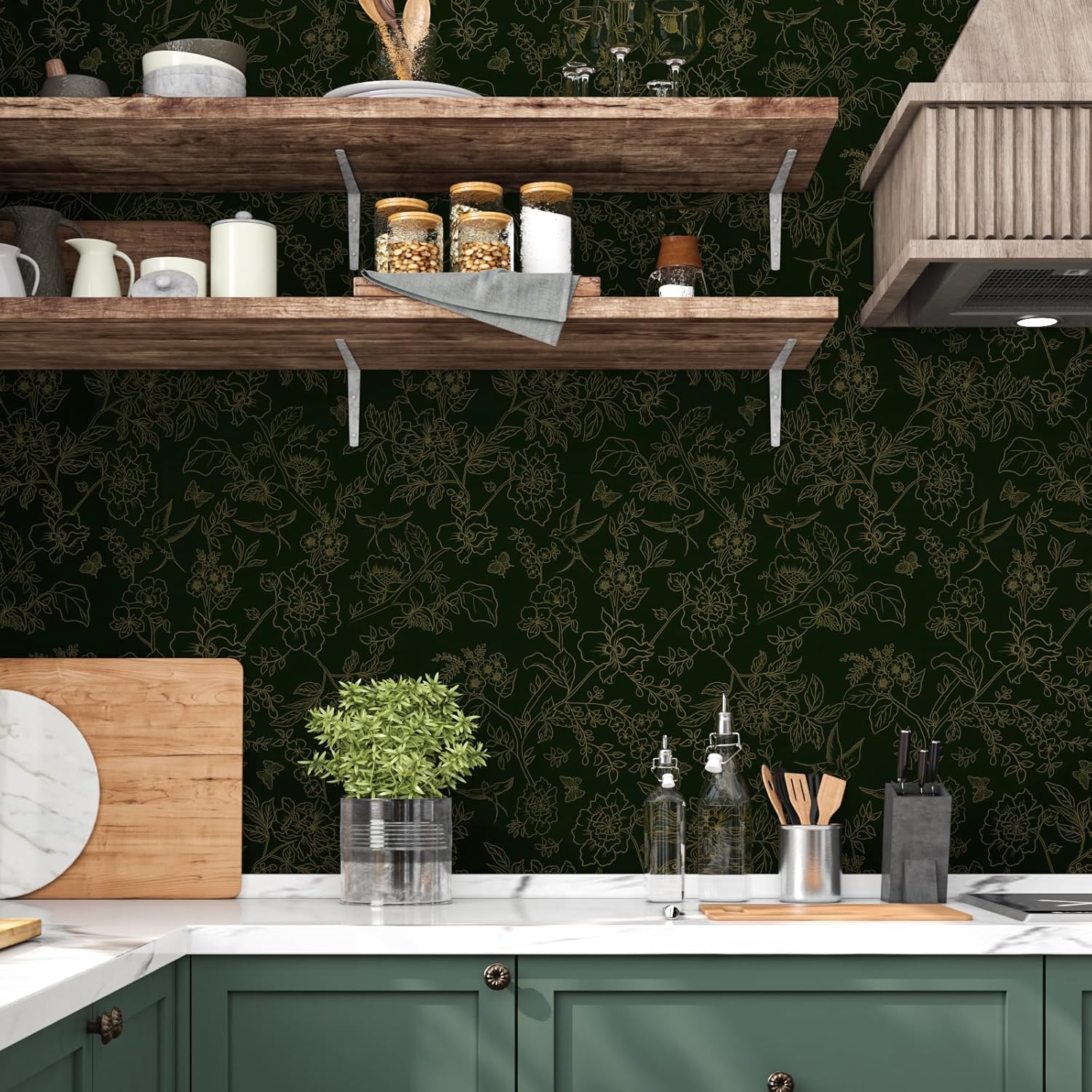 WALLPAPER FEATURE: ①Pattern and Color: Floral wallpaper with dark green background.②Size: A roll of wallpaper measures 17.5" x 394".③Material: Self adhesive wallpaper made of durable vinyl, which can be repositioned without leaving any glue.④Easy to Cut: The backing paper features clear grid lines, making precise cutting quick and easy.EASY TO INSTALL:1.Before applying the wallpaper, thoroughly clean the target surface to remove all dust and debris. Ensure the surface is dry, smooth and clean for optimal adhesion and finish.2.Measure the area to be covered accurately.3.Measure the area to be covered accurately.4.Avoid peeling off the entire backing at once. For large wall areas, work with a partner to achieve the best results. If the initial placement is unsatisfactory, simply reposition the wallpaper (it can be adjusted repeatedly).TIPS:1.Purchase sufficient rolls at one time to ensure they are from the same batch, avoiding color discrepancies.2.Due to differences in lighting and monitors, there may be slight color differences.PACKAGE:1 × Dark Green Floral Wallpaper