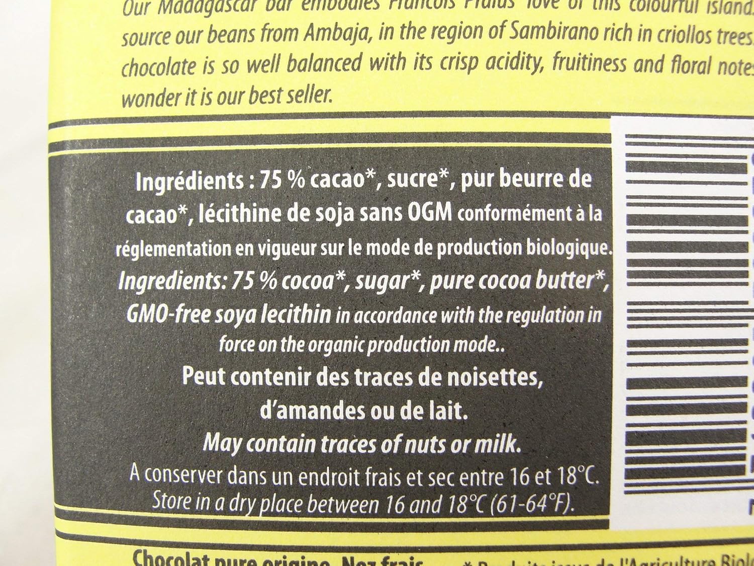 Francois Pralus now has his own plantation in Madagascar on the island of Nosy Be, also known as the "isle of perfumes". From Sao Tome by way of Brazil and Venezuela, Monsieur Pralus has personally selected cacao for the plantation from the finest origins in the world. The beans are grown, harvested, and fermented with care and then roasted and transformed into a delightful chocolate in his Roanne facility. Fresh nose, slightly minty and fruity, delicate to the taste, slightly acid. Organic 75% cocoa