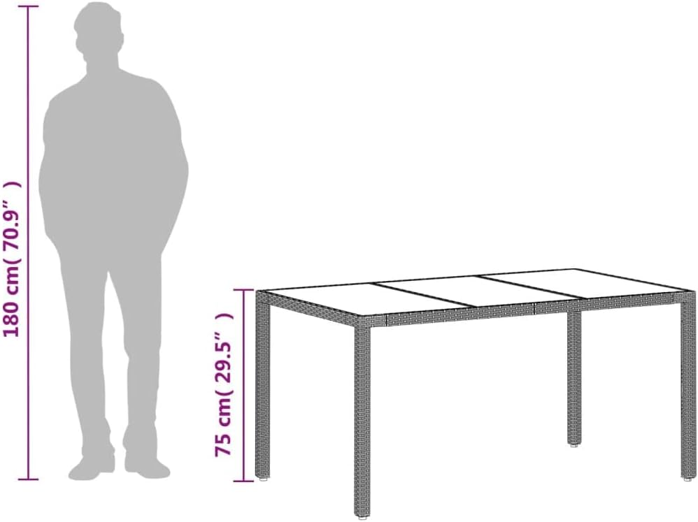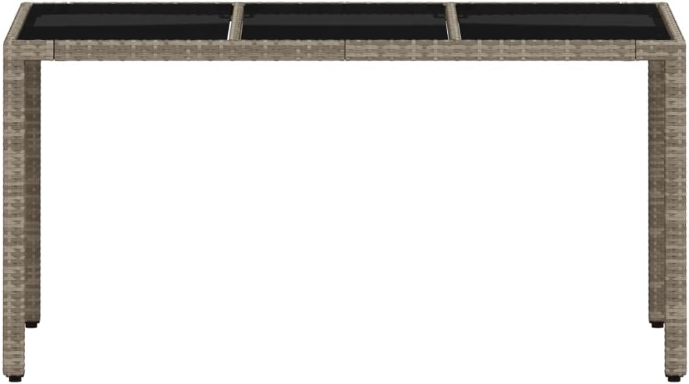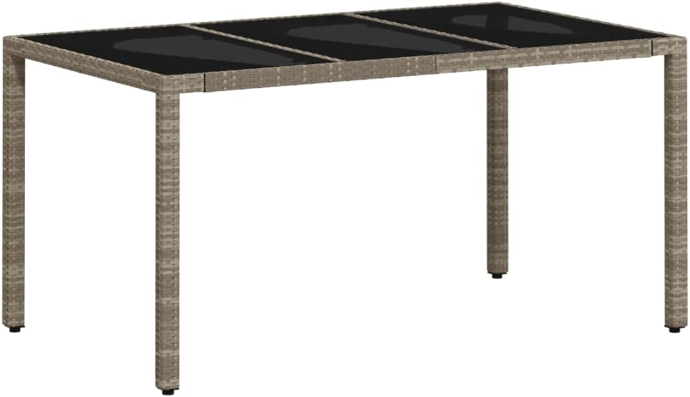 UV-Resistant Material: Made with high-quality poly rattan that can handle the sun without fading, ensuring lasting good looks and durability. This feature protects the material and boosts the table's strength for outdoor use.Spacious Design: At 59.1 in long and 35.4 in wide, this table has plenty of room for 6 diners — perfect for family meals and social events. Enjoy outdoor dining in comfort, with space for everyone during lively chats.Contemporary Appeal: The chic light grey tone and smooth glass top create an inviting atmosphere that lifts any outdoor space, whether for a casual brunch or a classy dinner party. Its modern charm fits into many styles, enhancing your space's visual appeal.Effortless Cleaning: The smooth glass surface makes cleaning a doddle, letting you relax more in your outdoor area and worry less about maintenance. A quick wipe down keeps the table looking sharp for your next gathering.Sturdy Construction: Built with a solid powder-coated steel frame and square legs to ensure stability, this table can withstand outdoor elements. Well-made for peace of mind during all your outdoor activities, keeping your table safe and dependable all season long.Color: Light GreyShape: RectangularMaterial: Synthetic Poly RattanFinish: Powder-CoatedIndoor/Outdoor: Outdoor OnlyCover Included: NoRoom: Garden and terraceCapacity: N/AMaximum Number of People: 6Dimensions: 35.4 x 59.1 x 29.5 in (W x L x H)Leg Height: 29.5 inWeight: 47.6 lbsDelivery Contains: Garden tableAssembly Required: YesRecommended Number of People for Assembly: 2