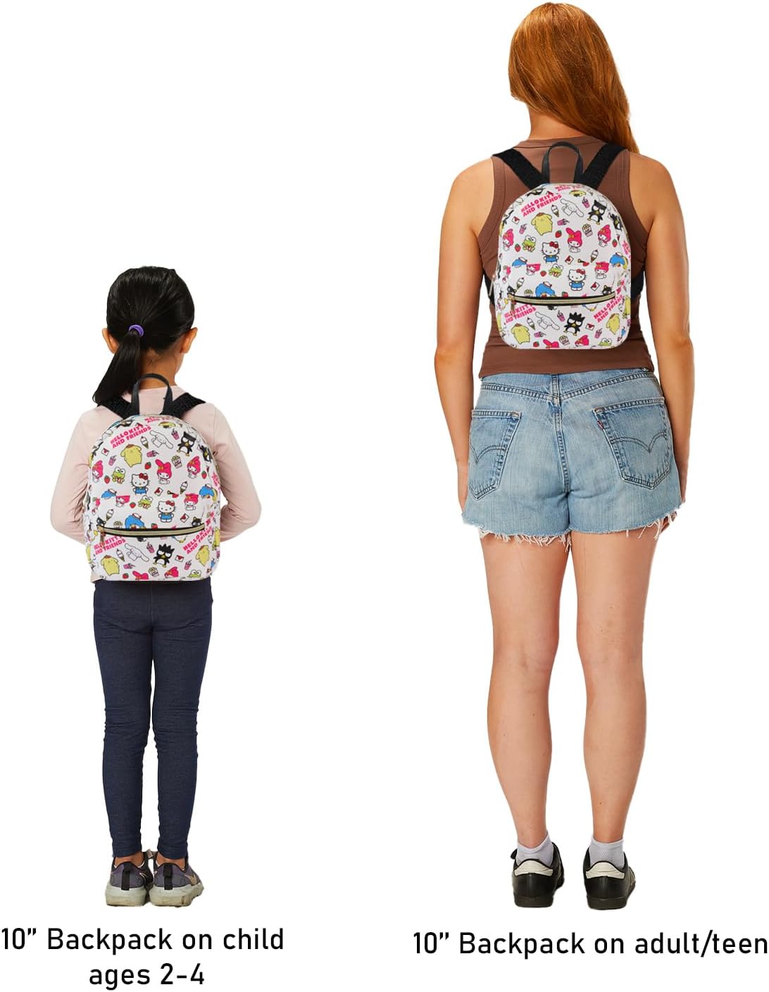 Hello Kitty and Friends Mini Backpack for Women - 10” Faux Leather Hello Kitty Backpack Purse with Front Pocket Plus Bookmark | Hello Kitty Backpack Small Bundle. This Hello Kitty and Friends backpack set includes a 10” faux leather backpack with adjustable shoulder straps, zip closure compartment, front pocket, and top loop for hanging featuring colorful artwork of favorite Hello Kitty and friends characters. This Hello Kitty backpack for teens and adults contains plenty of room to carry your wallet, phone, and any other small items you need to take to a theme park, on vacation, or on the go. Show off your love of your favorite Hello Kitty friends in style. This Hello Kitty backpack bundle also includes a bonus bookmark, making the perfect gift set for any Hello Kitty fan. Officially licensed Hello Kitty and Friends backpack set is perfect for fans of all ages, teens and adults alike.