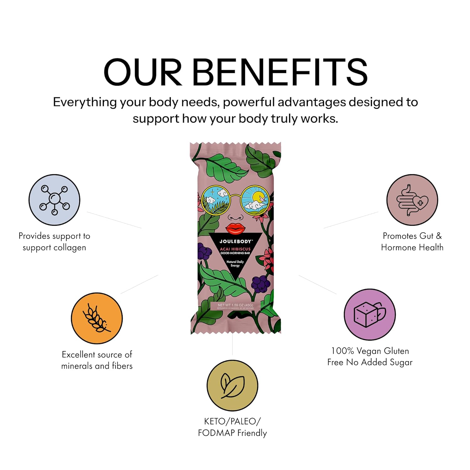 Most mornings, there is no time for breakfast. Not real breakfast. You reach for whatever is nearest and fastest - and somewhere between the commute and the first meeting, you already know it wasn't enough. That search for a whole food bar for busy mornings that actually does what it promises is what Joulebody was built to end. Joulebody Good Morning Bars are a plant based best meal replacement bars with no artificial sweetener - built around a single principle: every ingredient should exist in nature without a manufacturing step. Organic acai, organic hibiscus, chia seeds, hemp seeds, flax, pumpkin seeds, puffed quinoa, and dates. That is the entire list. No gums, no binders, no protein isolates, no seed oils, no "natural flavors." This is a real food bar with no protein isolates, designed to function as a grab-and-go breakfast bar, a commute snack, or a post-workout fuel stop - wherever your morning takes you. At 240 calories per bar with 10g of plant protein and 7g of fiber, every calorie is working. The fiber in this bar comes from the seeds themselves - chia, hemp, flax, and pumpkin. This gluten free breakfast bar with prebiotic fiber sources its 7g of fiber from whole-food seeds, not from chicory root inulin or fortified fiber extracts. The result is a gut friendly snack bar that supports your digestive routine - made with seed-based fiber your body recognizes. Seed-based prebiotic fiber slows digestion gradually, extending satiety through your morning rather than producing a brief spike and crash. This is a plant-based bar sweetened with dates & tapioca syrup. No monkfruit, no stevia, no allulose, no erythritol, no sugar alcohols. The sweetness is light and fruit-forward - a berry-driven acai note with a hibiscus finish that makes this a meal replacement bar that doesn't taste like candy. The puffed quinoa provides a gentle chewy-crunch texture that is neither dry nor sticky. This organic bar with puffed quinoa crunch holds up at room temperature or chilled, making it a reliable office snack or a breakfast bar for new moms on the go who need something they can eat in two minutes without thinking about it. Plant-based, gluten free, and made with organic superfood seeds, Joulebody Good Morning Bars fit clean eating routines, elimination diets, and anyone who has spent too long reading labels and finding reasons to put the bar back. Each box contains 10 bars. Keep one in your bag, on your desk, or on your counter. Your mornings are already complicated enough.