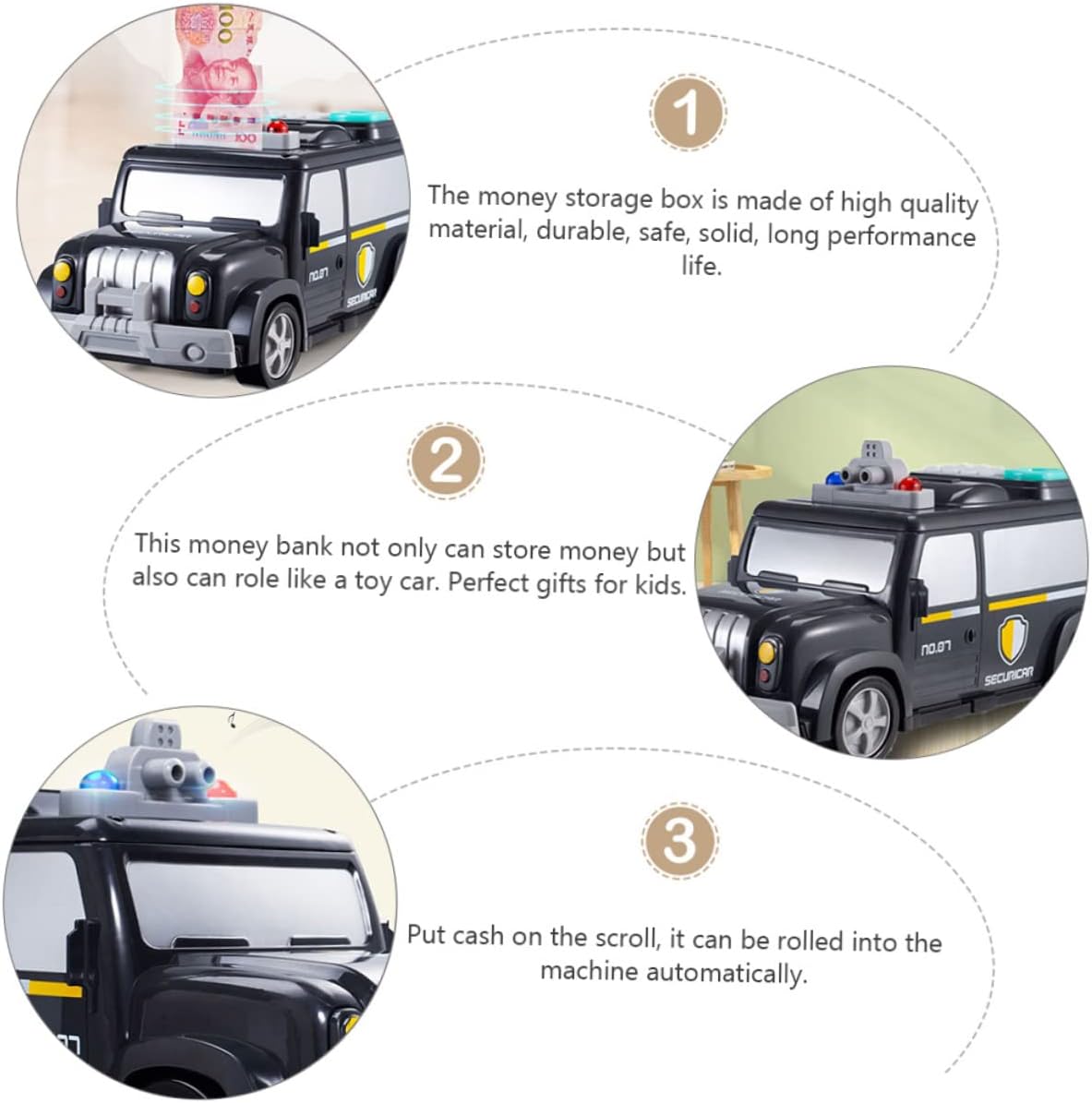 Package List 1 x present box 1 x specification 1 x screwdriver 7 x paper 1 Features -Material: ABS and electronic components Car Piggy Bank -Color: Black,White Securicar -Size: About 27X14X13cm/10.61X5.5X5.11in Cash Car - This funny piggy bank will bring of fun to you Moneybox. - Can be used both as a piggy bank and as a Educational - Delicate surface, beautiful design, is safe and Password Cash Truck. - Rich early education content and between English and Chinese with one click Digital Piggy Bank. - Automatic banknote rolling function, can learn how it works .Goods DescriptionMoneybox Safe and healthy, learning while playing.Educational The set of money saving box and car plaything is made of material. The early educational with realistic shape is really great, help familiar with the money and