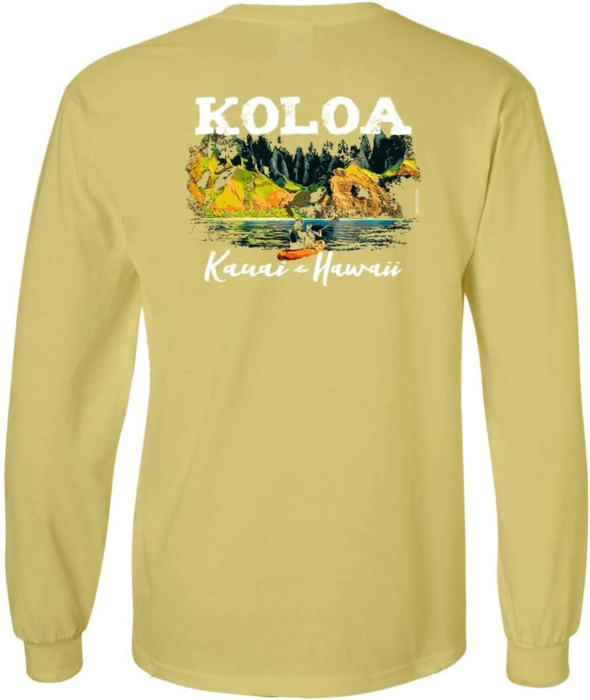 Koloa Surf Mens Kauai Coastline Classic Logo Long Sleeve Tee. Large Kauai Coastline logo on back of tee and small Classic Wave logo on front. Nothing beats this traditional t-shirt in comfort, versatility and casual style. 6.1-ounce, 100% soft spun cotton. 98/2 cotton/poly (Ash). 90/10 cotton/poly (Athletic Heather). 50/50 cotton/poly (Dark Heather). Rib knit collar. Shoulder to shoulder back neck tape.
