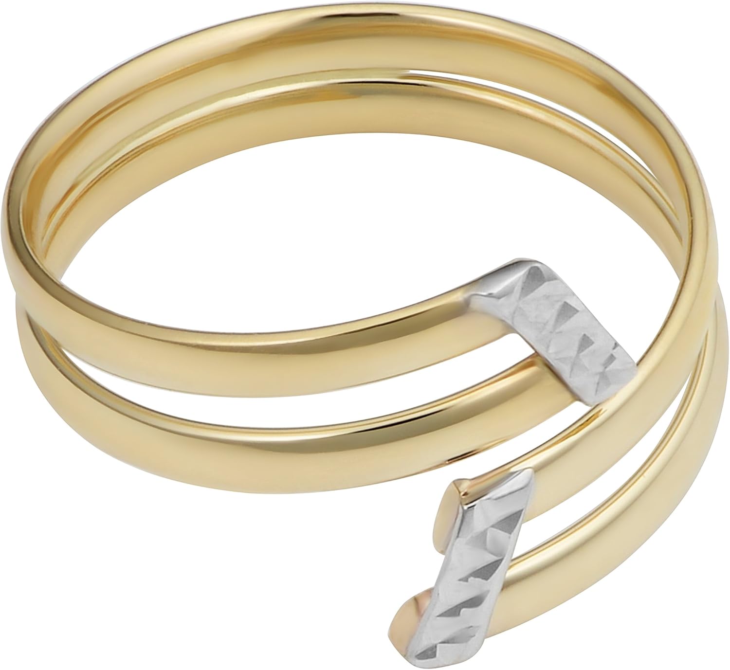 This womens gold ring is beautifully crafted in Italy of genuine 14k yellow gold and 14k white gold and it showcases a gold bypass ring style. The design of this gold ring is simply eye catching, which makes it an excellent fashion piece with any attire.