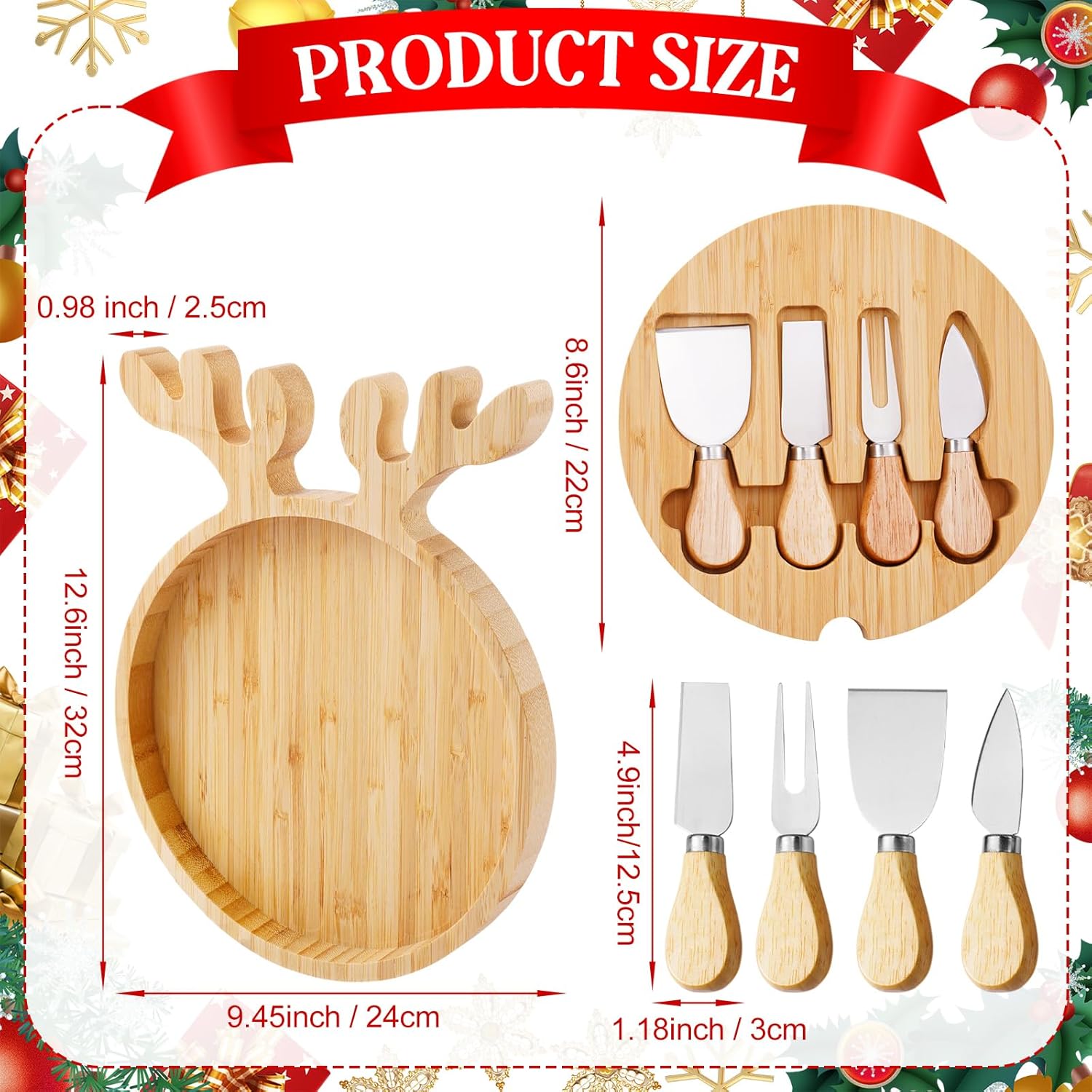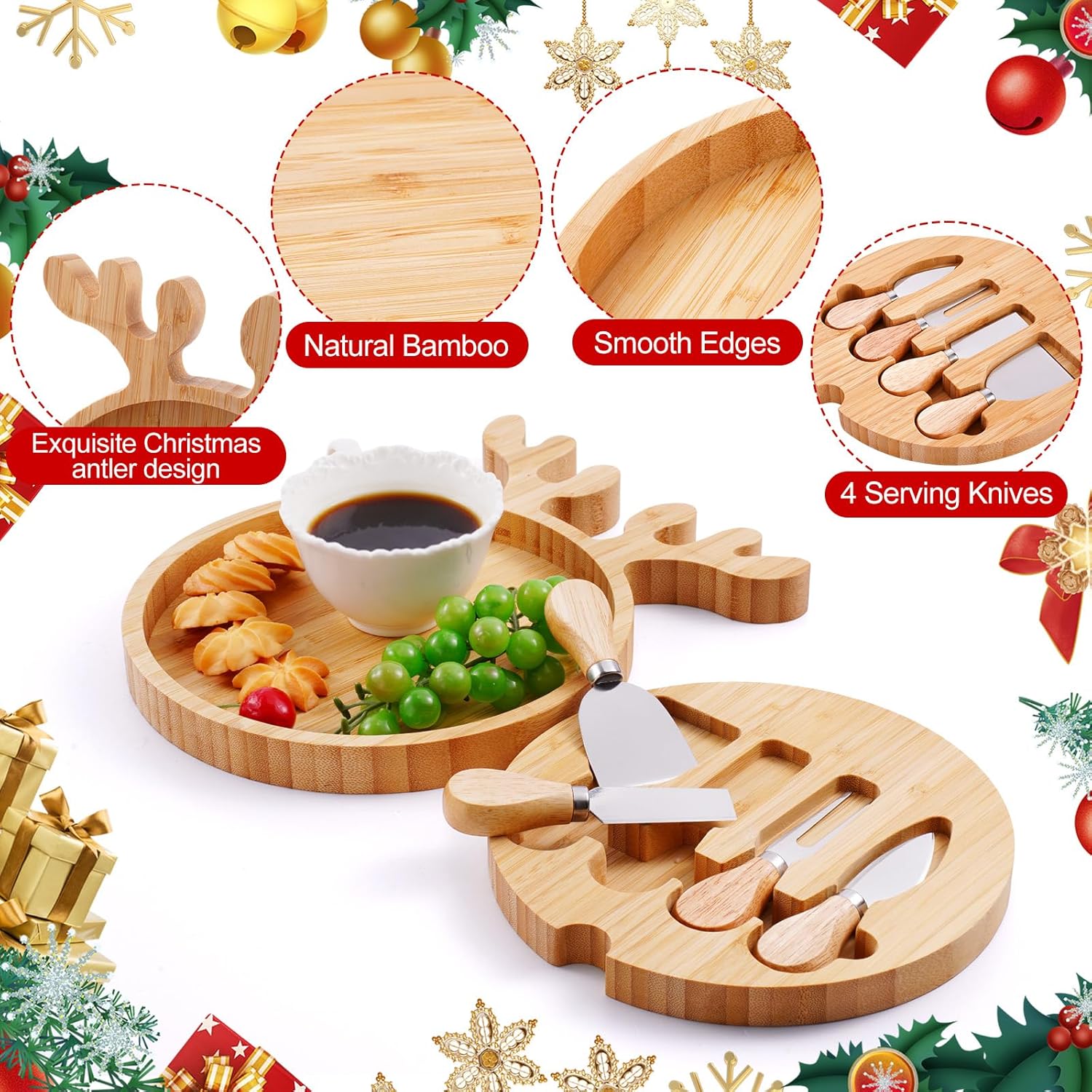 Features: Ideal for Gifting: Enhance home decorations with a charming retro style using these designed antler shape trays. Suitable for gifting on occasions like weddings, housewarmings, or festive celebrations such as Christmas, they're sure to impress friends and family alike Versatile: From hosting a party to a Christmas picnic, this versatile charcuterie board enhances your space. The Christmas bamboo plate can be easily matched with various home decorations, easily creating a strong Christmas atmosphere for you Basic Information: Material: bamboo Color: wood color Size: 12.6 x 9.45 x 0.98 inch/32 x 24 x 2.5 cm Package Include: 1 x Christmas tray 1 x Knife 1 x Fork 1 x Cheese spreader. 1 x spreading knife Warm Note: Manual measurement, there may be slight differences in size Due to the screen display, the color of the item may differ slightly from the picture