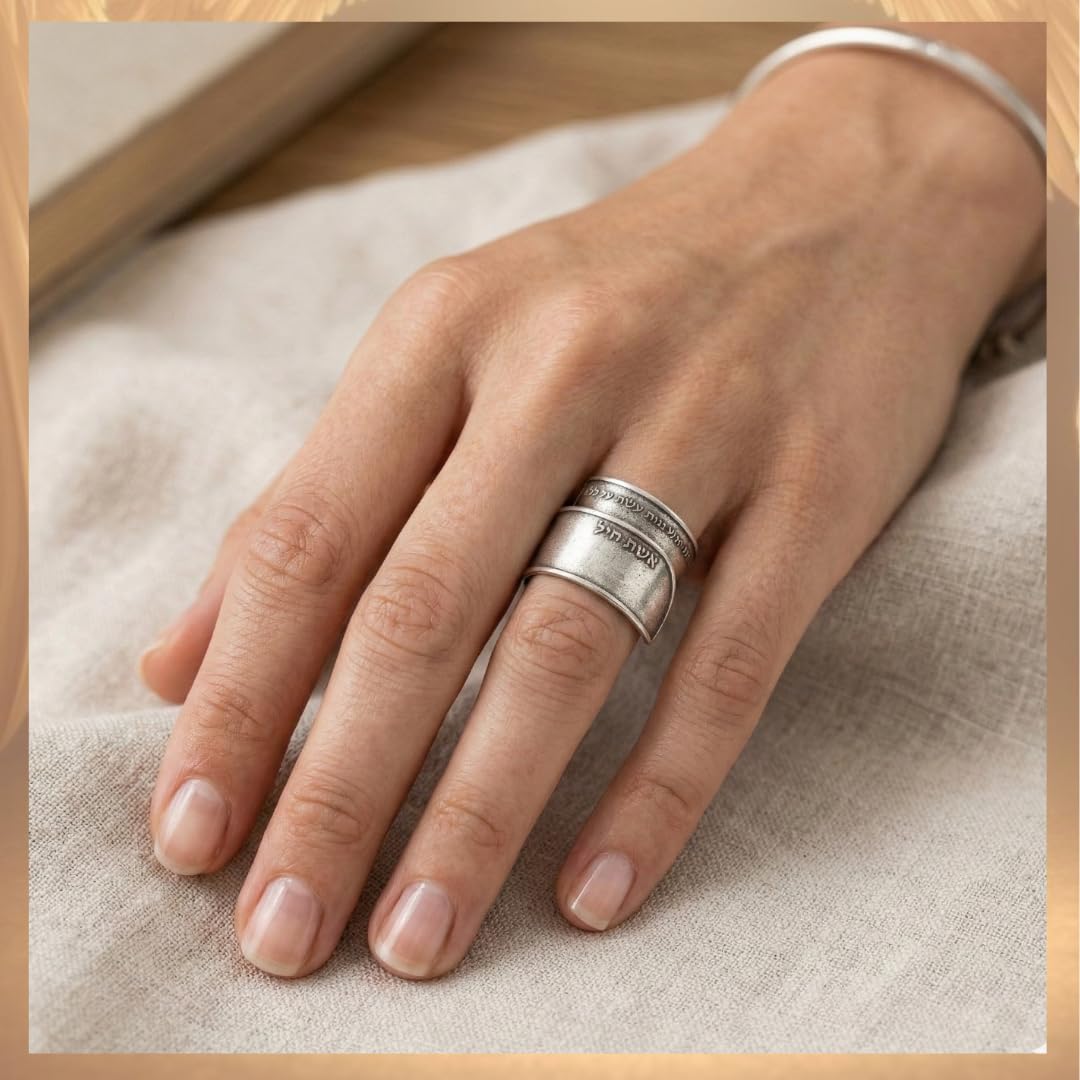 Ring For Women, Ring Engraved With Hebrew Jewish Women Of Valor Words Prayer, Open Adjustable Ring, Handmade Spiritual Jewish Jewelry Gift For Mom, Made In Israel By HallelJewelry Unique Jewish ring made from 925 sterling silver-plated brass or Gold plated brass, or Solid sterling silver, engraved with Hebrew words. This beautiful wide-open ring is coiled around itself and can be adjusted to any finger size. Inside the ring engraved the entire psalm of "Eshet Chail" ("women of valor"), in small but readable letters. This is a unique and powerful ring for any woman you love and appreciate. Its beauty cannot be ignored. if you are looking for a gift that is not just an adornment but has a spiritual and powerful value - this ring is perfect for you. Get this ring to the woman you love, it will be cherished forever.
