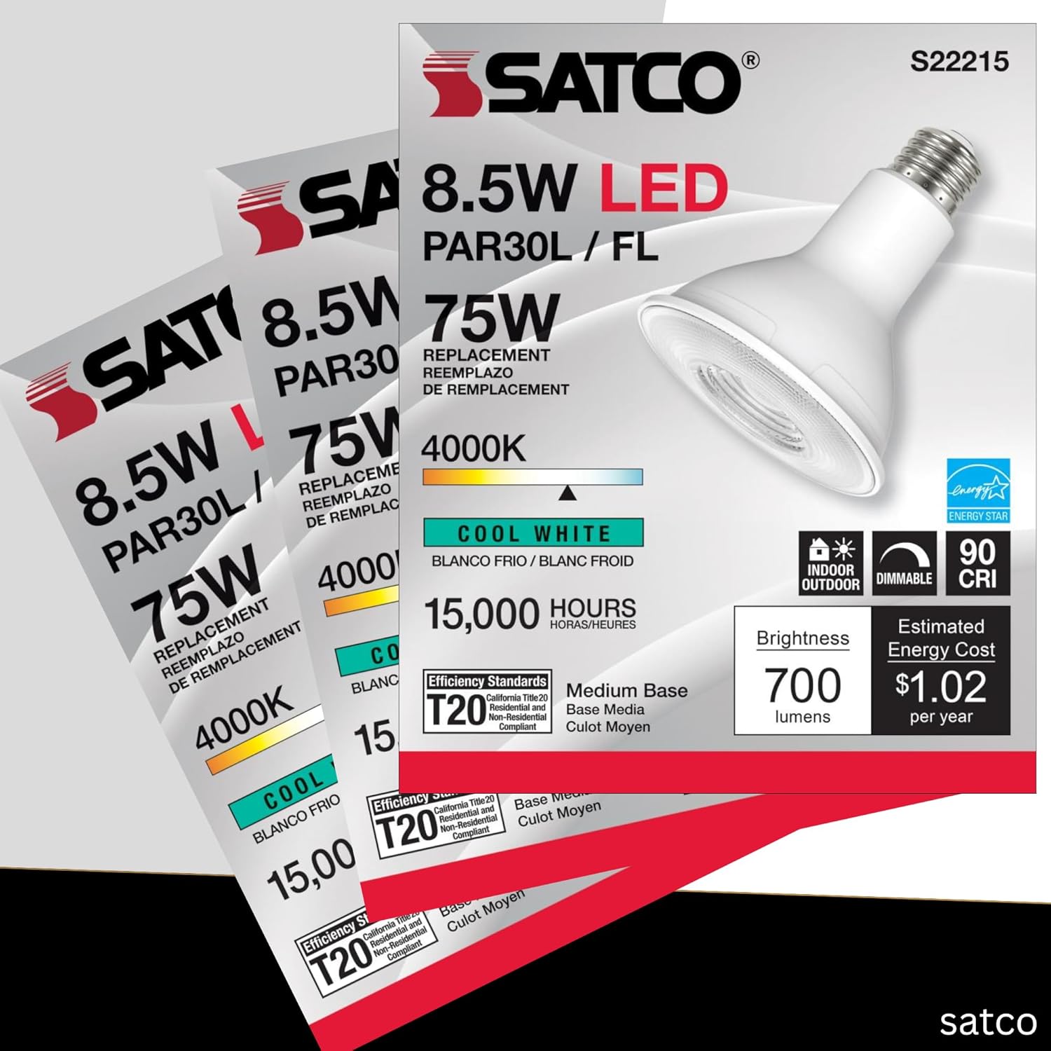 The Satco S22215 LED PAR30L long neck flood lamp is a high-quality replacement for traditional 75-watt incandescent bulbs, designed to deliver superior brightness and clarity in residential or commercial settings. Using only 8.5 watts, this dimmable lamp produces 700 lumens of crisp 4000K cool white light with a high color rendering index (90+ CRI) to enhance visibility and accurate color representation. Perfect for task lighting, retail displays, or general ambient lighting, it features a focused 40° beam angle and a clear polycarbonate lens for even light distribution. Its medium E26 base ensures easy installation into standard fixtures, and it is safe for use in fully enclosed luminaires. Built to last 15,000 hours, the S22215 is wet-location rated and can handle both indoor and outdoor environments. Certified by cULus, RoHS, and FCC, and backed by a 2-year warranty, it offers dependable performance and energy savings across a wide range of lighting applications.