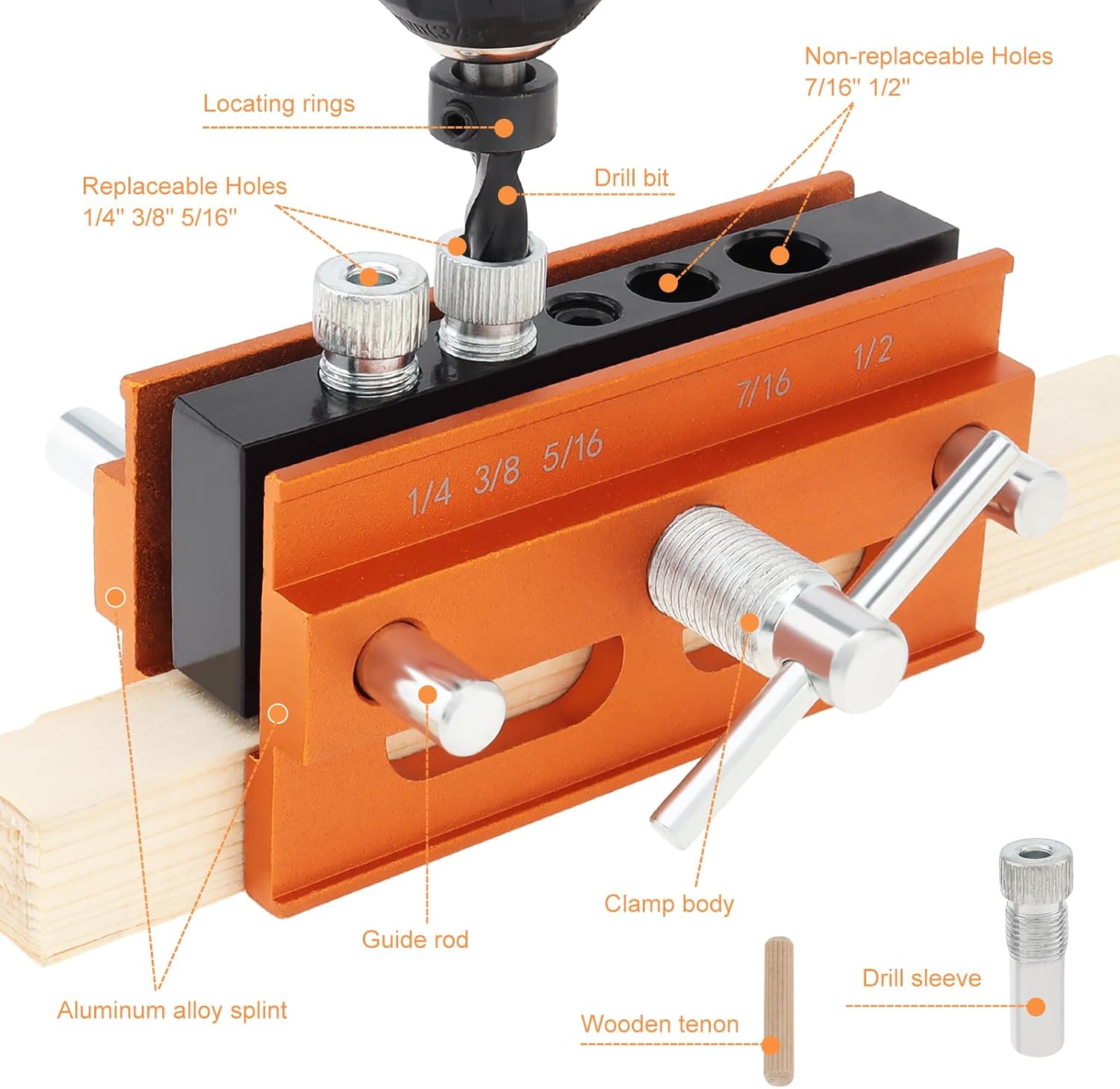 • What You Will Get: A self-centring jig, an instruction manual, supplied with six hardened steel bushings; two each of 1/4-inch, 5/16-inch and 3/8-inch, three High Speed Steel Drill Bits, thirty Wooden Dowels, 1 Hexagon Wrench.