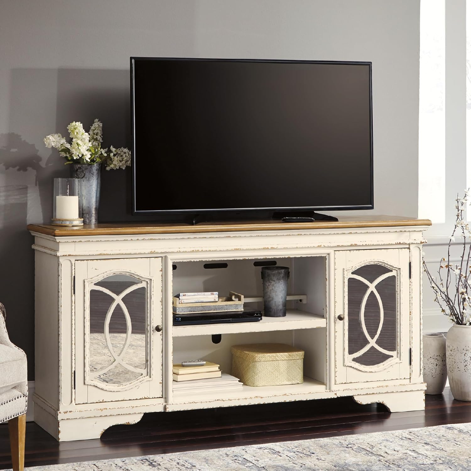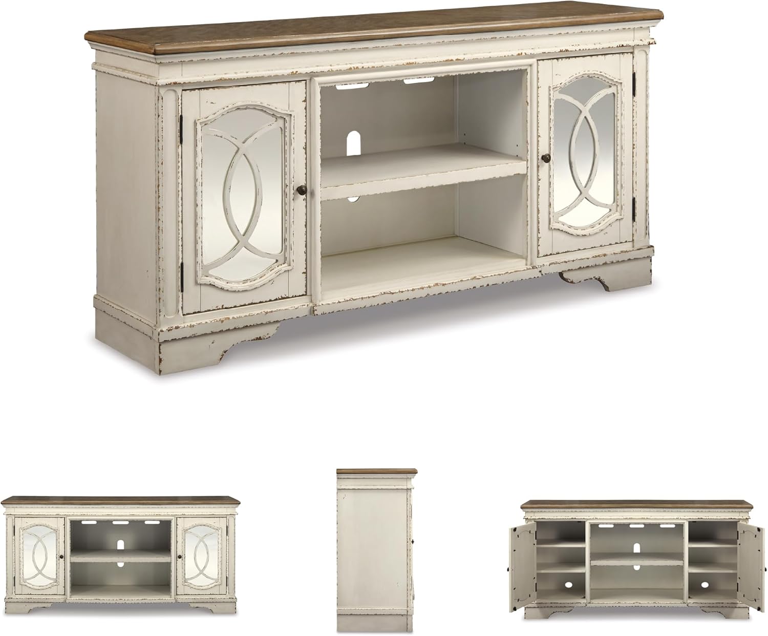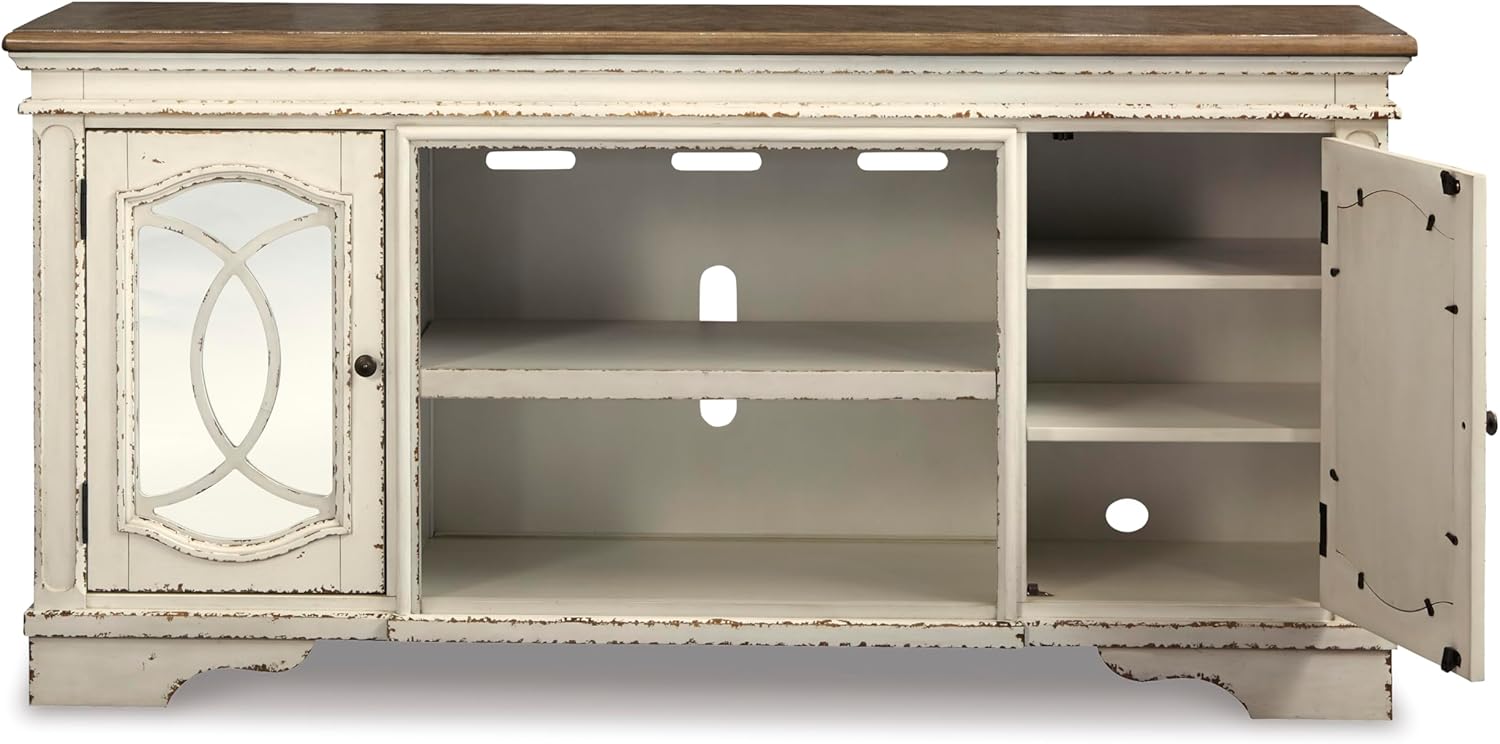 Elevating the art of traditional cottage styling, the Realyn TV stand with fireplace option is beautifully in tune with your taste. Antiqued two-tone aesthetic blends a chipped white with a distressed wood tone top for added charm. Cabinet doors’ decorative fretwork over mirrored glass adds a lovely twist. Compatible with W100-21 fireplace insert (sold separately).
