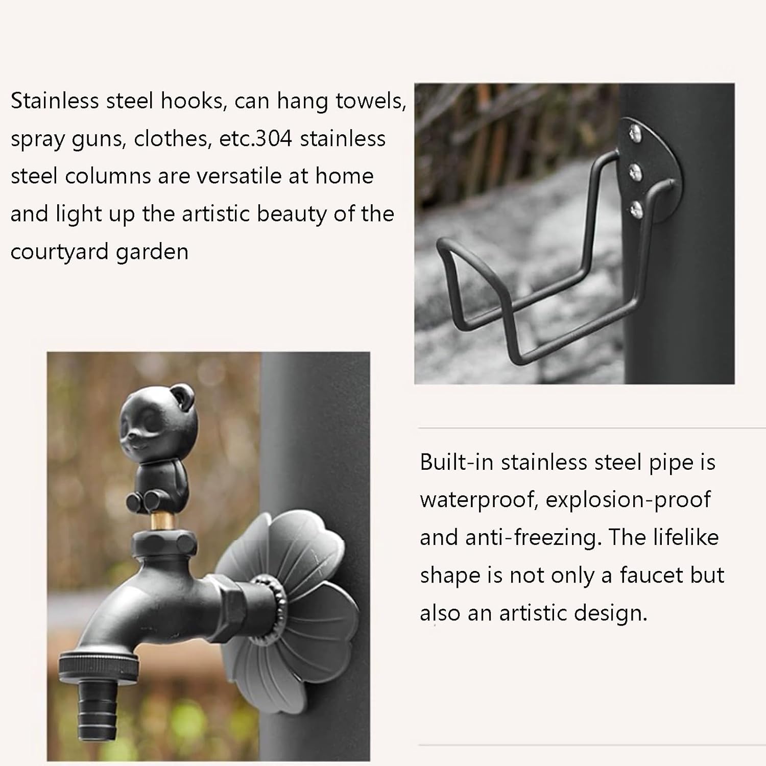 Enhance your outdoor space with our elegant freestanding water column, designed for both functionality and style. Perfect for watering your garden or providing a convenient handwashing station, this outdoor column faucet is a versatile addition to any setting. Crafted from high-quality 304 stainless steel, it promises durability and a modern aesthetic that complements various landscapes. Our water column features a thoughtfully designed garden hose holder, keeping your hose off the ground and ensuring your garden remains tidy. Choose from an array of faucet styles, including dragon faucets and lock faucets, to suit your specific needs. The stainless steel valve core enhances reliability, ensuring smooth water flow and longevity. This outdoor faucet is built to withstand the elements, featuring anti-freeze properties that make it ideal for year-round use. Its applications are endless—perfect for villas, courtyards, gardens, schools, parks, and workshops. Each water column comes with essential accessories, including a 7.5m spray gun, a stainless steel hook, faucet insulation cotton, and a reinforced fixed base for secure installation. Available in dark gray, our water columns come in three sizes to fit your space: - 50cm height, 10.5cm width, 13cm base (water inlet 120mm off the ground) - 86cm height, 10.5cm width, 20.5cm base (water inlet 120mm off the ground) - 86cm height, 6.4cm width, 20.5cm base (water inlet 120mm off the ground) Transform your outdoor area into a functional and stylish retreat. Should you have any questions, our customer service team is here to assist you. Enjoy your shopping experience!