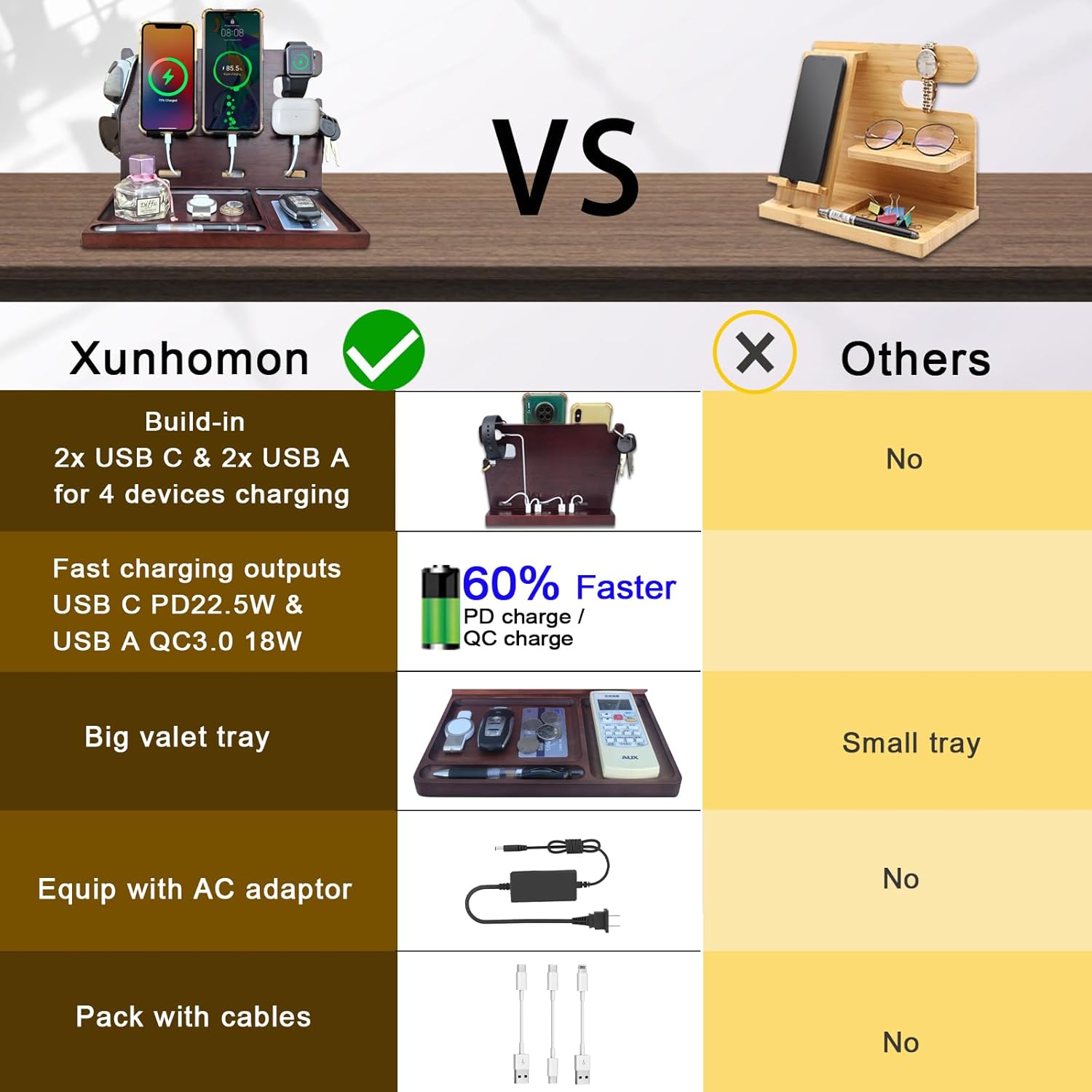 | BuiltIn Media | 1*AC power supply, 1*USB A to USB C cable,1*USB A to lightning cable,1*USB C to USB C cable, 1*User manual, 1*Wood desk organizer with charging station, 3*metal stand |