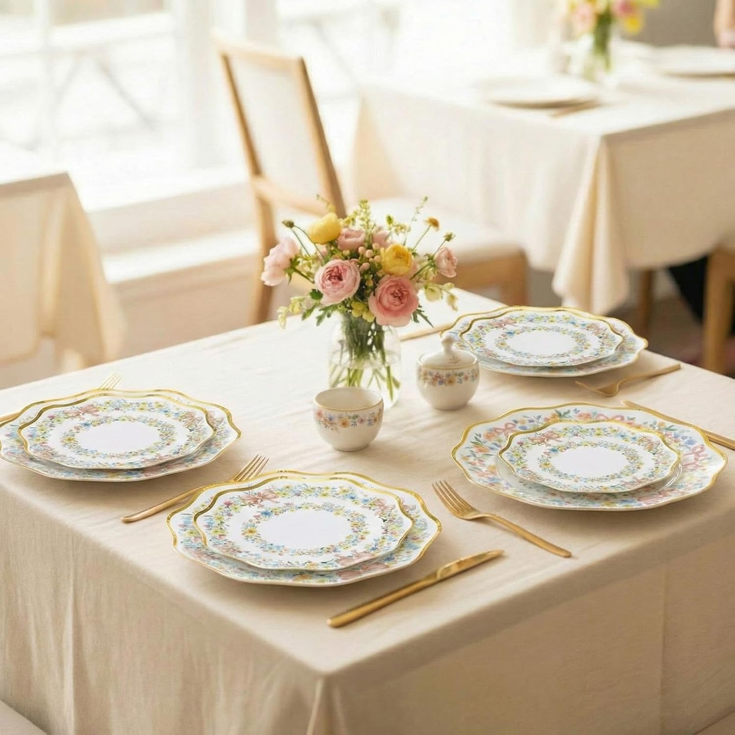 Feature: Versatile Pairings: Our set includes two plate sizes: a large 10.5-inch plate perfect for main courses and salads, and a smaller 8.5-inch plate ideal for desserts, bread, or fruit. These sizes offer flexibility, making them perfect for a variety of dining occasions. Charming Party Decor: The refreshing floral prints and elegant wavy edges of these tea party plates instantly enhance the atmosphere of any gathering. They become a focal point of your table setting. Specifications: Color: multicolor Material: paper Size in small: 8.5 inches (Diameter) Size in big: 10.5 inches (Diameter) Package includes: 25 x 10.5" Floral dinner plates 25 x 8.5" Floral dessert plates Warm notes: Please allow slight errors in size due to manual measurement. Due to different angles of light and shadow effects, please allow a little color difference with the pattern