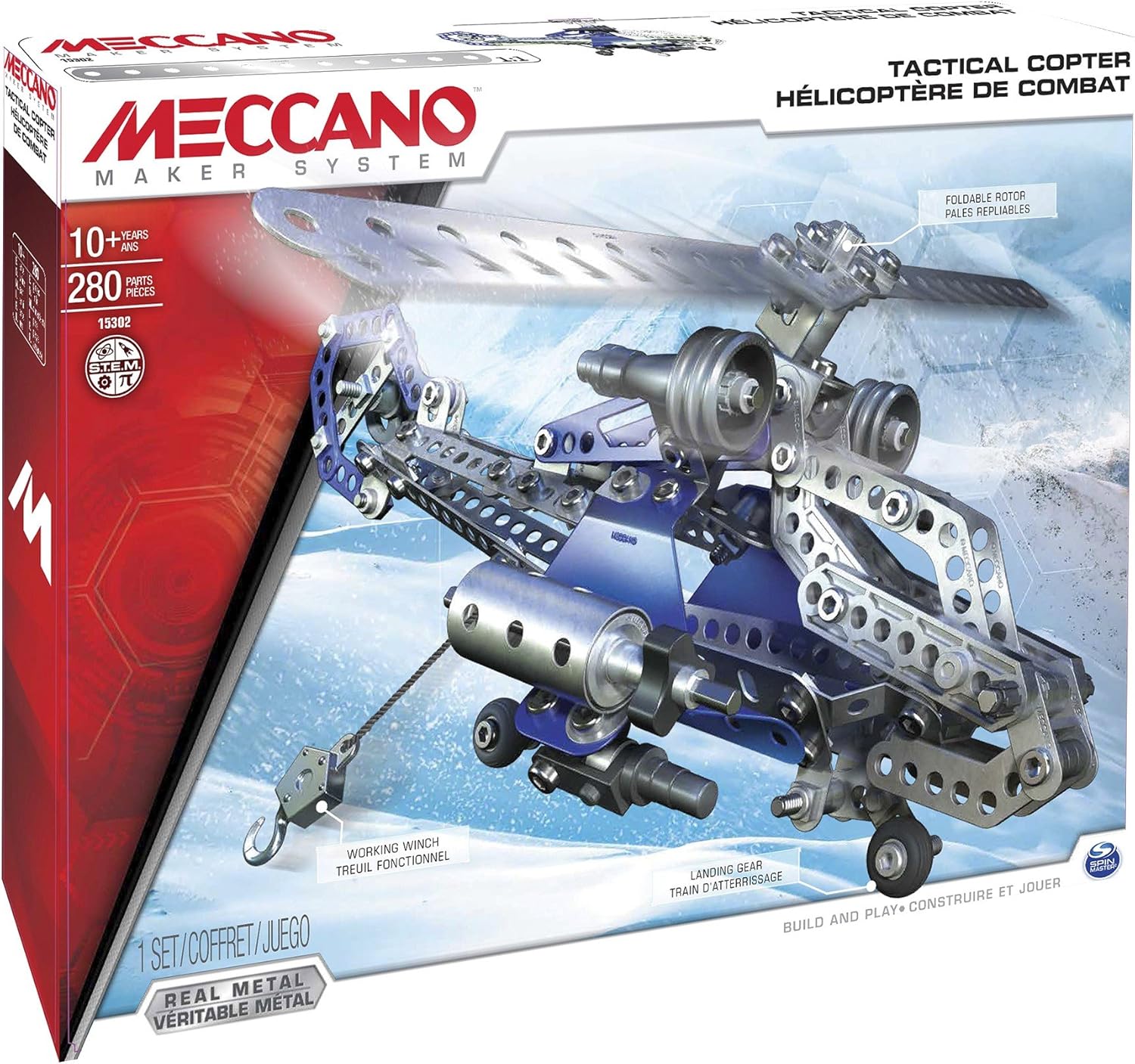 Let your imagination soar into the world of real engineering with the Meccano Elite Helicopter! Build and fly this mechanical masterpiece with detailed features and precision-made rotating parts. Perform your own manoeuvres using the retractable landing gear, folding rotors and working winch. Mission accomplished? Remodel your chopper into a fully functional performance glider. Then, customize it to invent a revolutionary new vehicle capable of anything your imagination allows! The Meccano Elite Helicopter set comes with 374 parts , 2 real tools and easy-to-follow instructions. Explore the mechanical wonders of the world as you prepare your Elite Helicopter for flight! The future is yours to build with Meccano.