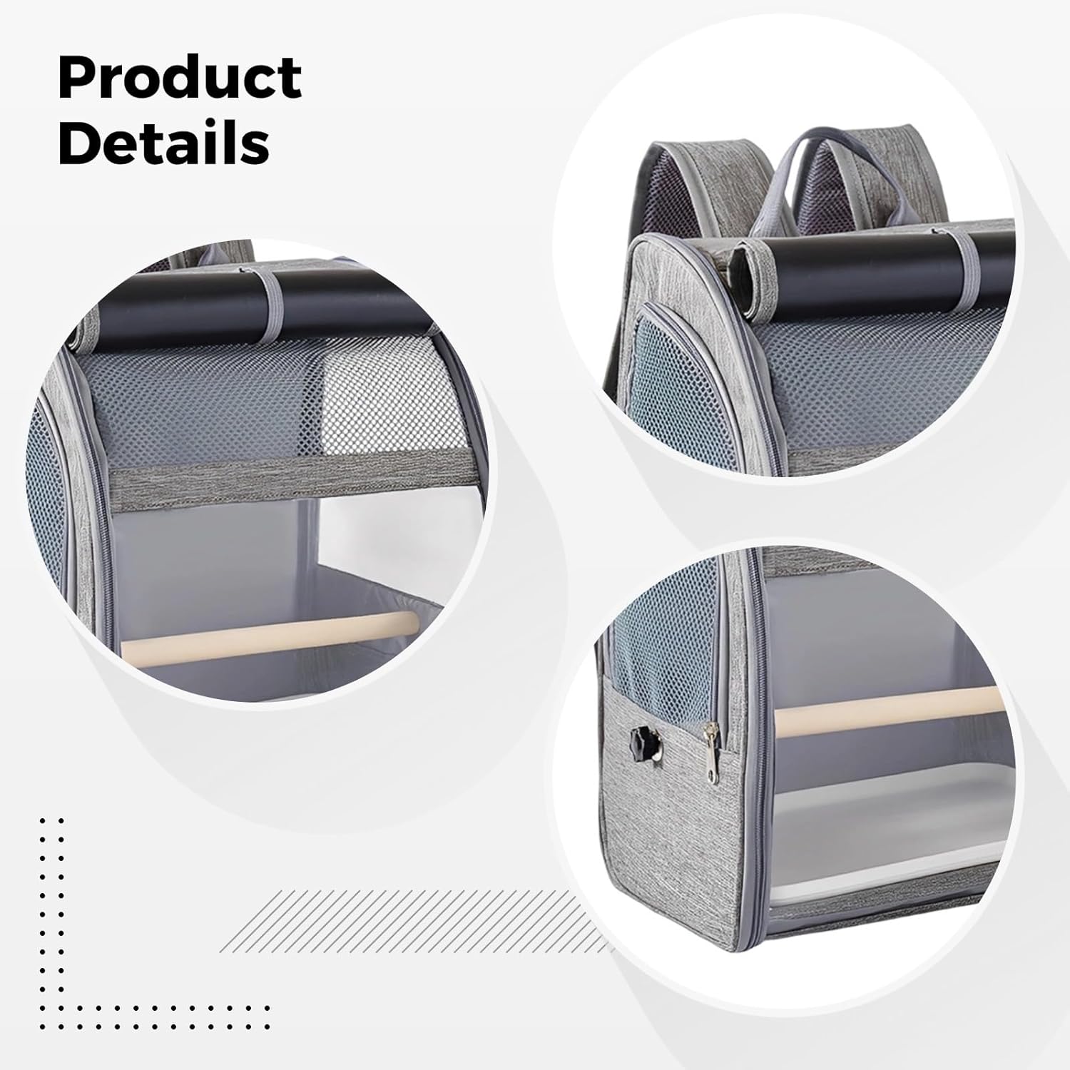 Color: Gray Material: Fabric,Plastic,Wood Size: 12.2 x 9.6 x 15 in / 31 x 24.5 x 38 cm Package Includes: 1 x Bird Carrier,1 x Removable Wooden Perch,1 x PP Tray Note: - Please refer to the measurement. Tiny measuring error is allowable in normal range. - There might be a little color difference due to the monitor, camera or other factors, please refer to the physical item.